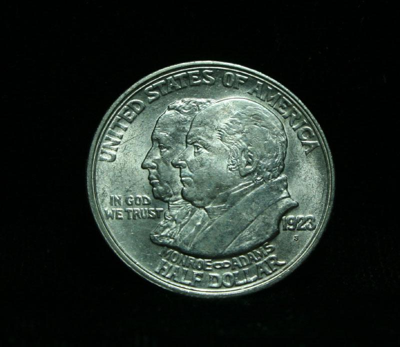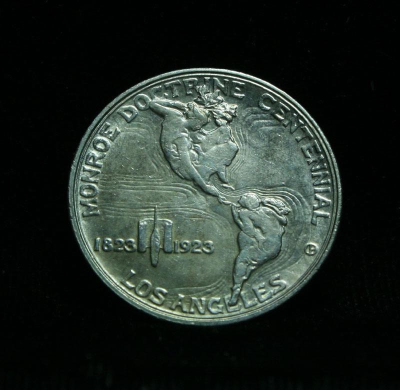 A Super Example, white with a great strike. One may think that the reverse is the two continents of The western Hemisphere but upon closer examination you will see that they are two women bent into the general shapes of the two continents. When examining a Monroe Commemorative the cheeks of the two statesmen on the obverse and the figures that represent the two continents on the reverse are the highpoints and will show wear first. Coin World's Coin Values lists ms63 at $140 and The Wholesale Greysheet lists ms63 at $100. Estimated Value $125