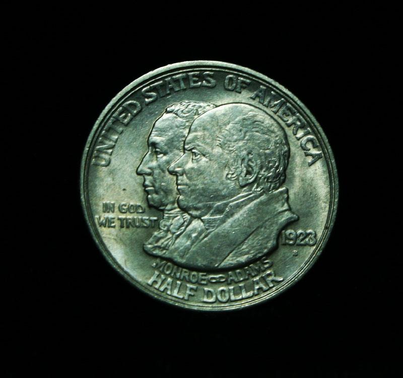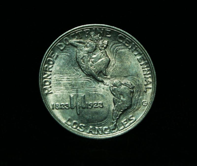 A very nice example, white with good luster. One may think that the reverse is the two continents of The western Hemisphere but upon closer examination you will see that they are two women bent into the general shapes of the two continents. When examining a Monroe Commemorative the cheeks of the two statesmen on the obverse and the figures that represent the two continents on the reverse are the highpoints and will show wear first. Coin World's Coin Values lists ms63 at $140 and The Wholesale Greysheet lists ms63 at $100 and ms64 at $185. Estimated Value $125