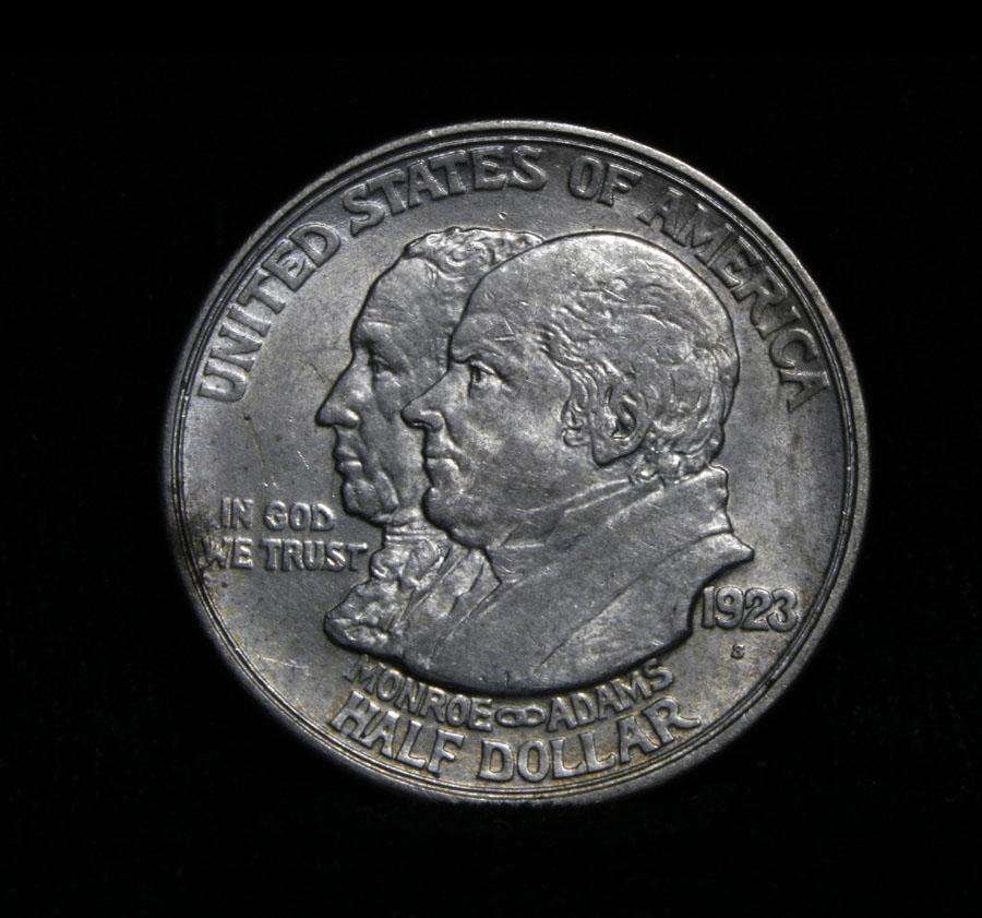 A nice example with a good strike. One may think that the reverse is the two continents of The western Hemisphere but upon closer examination you will see that they are two women bent into the general shapes of the two continents. When examining a Monroe Commemorative the cheeks of the two statesmen on the obverse and the figures that represent the two continents on the reverse are the highpoints and will show wear first. .This coin has a planchet flaw of the reverse which turns into a crack at the rim. It does not reduce the grade as it is not wear but a Planchet Flaw, some may even say it increases rarity and value. Coin World's Coin Values lists au50 at $65 and ms60 at $85 and The Wholesale Greysheet lists au50 at $46 and ms60 at $60. Estimated Value $60