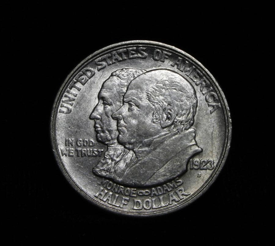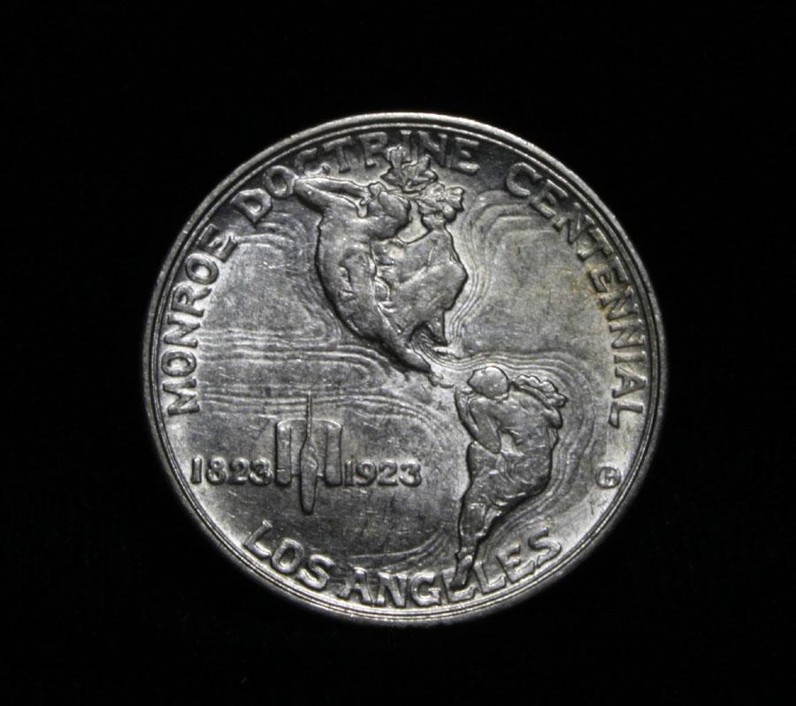 A nice example with a good strike. One may think that the reverse is the two continents of The western Hemisphere but upon closer examination you will see that they are two women bent into the general shapes of the two continents. When examining a Monroe Commemorative the cheeks of the two statesmen on the obverse and the figures that represent the two continents on the reverse are the highpoints and will show wear first. .This coin has a planchet flaw of the reverse which turns into a crack at the rim. It does not reduce the grade as it is not wear but a Planchet Flaw, some may even say it increases rarity and value. Coin World's Coin Values lists au50 at $65 and ms60 at $85 and The Wholesale Greysheet lists au50 at $46 and ms60 at $60. Estimated Value $60
