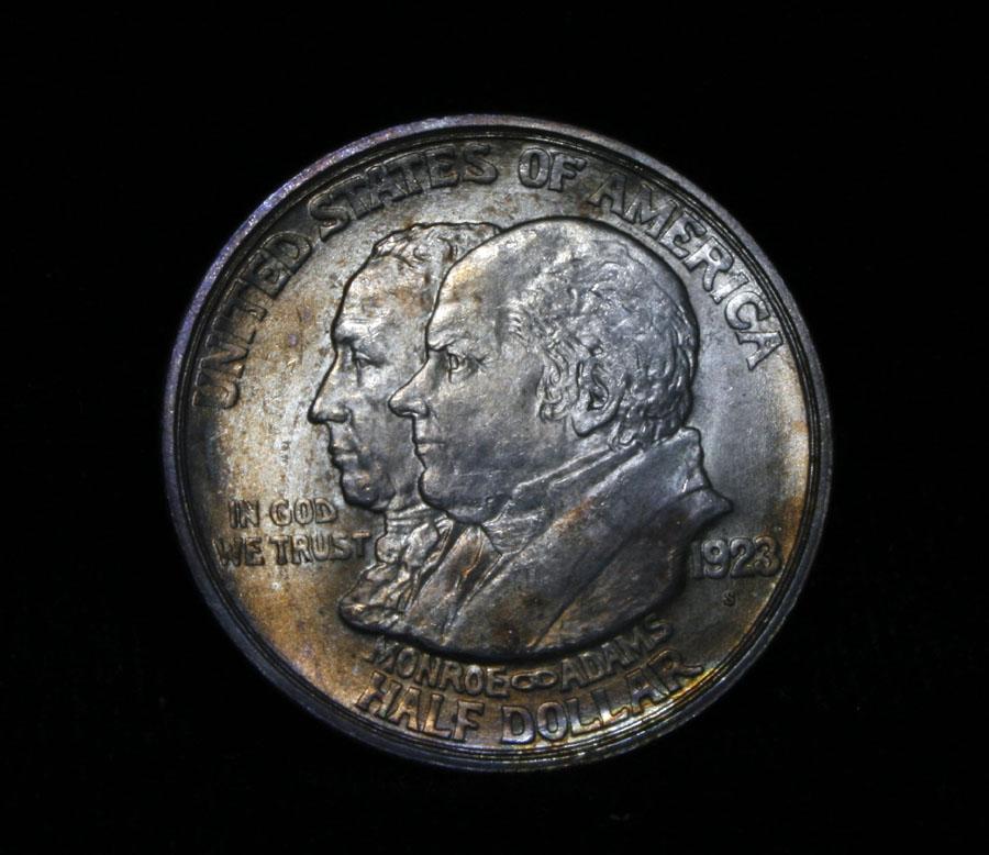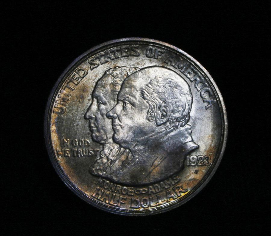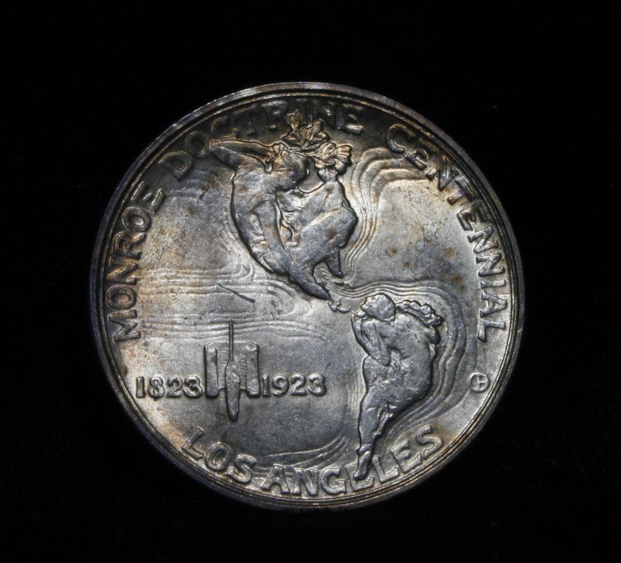 A beautiful all original PQ example, with great luster and a nice strike. One may think that the reverse is the two continents of The western Hemisphere but upon closer examination you will see that they are two women bent into the general shapes of the two continents. When examining a Monroe Commemorative the cheeks of the two statesmen on the obverse and the figures that represent the two continents on the reverse are the highpoints and will show wear first. Coin World's Coin Values lists ms64 at $450 and ms65 at $2100 and The Wholesale Greysheet lists ms64 at $300 and ms65 at $1450. Estimated Value $400