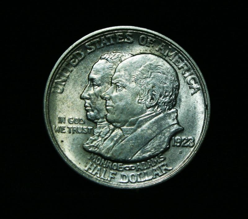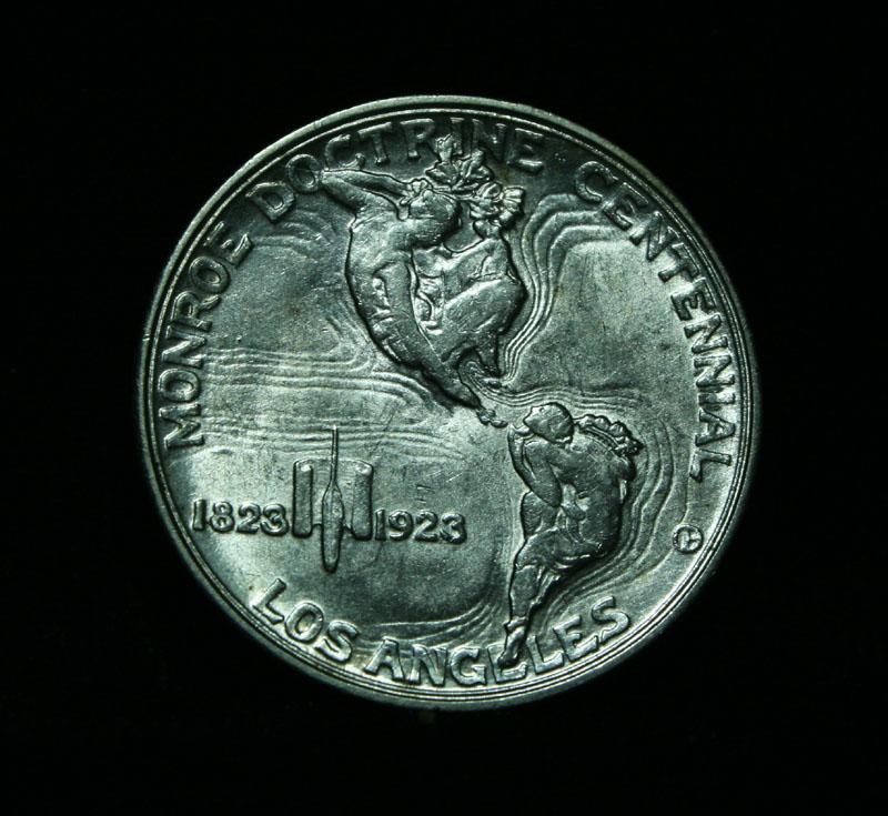 A great example, Super Luster and a good Strike. One may think that the reverse is the two continents of The western Hemisphere but upon closer examination you will see that they are two women bent into the general shapes of the two continents. When examining a Monroe Commemorative the cheeks of the two statesmen on the obverse and the figures that represent the two continents on the reverse are the highpoints and will show wear first. Coin World's Coin Values lists ms64 at $450 and ms65 at $2100 and The Wholesale Greysheet lists ms64 at $300 and ms65 at $1450. Estimated Value $400