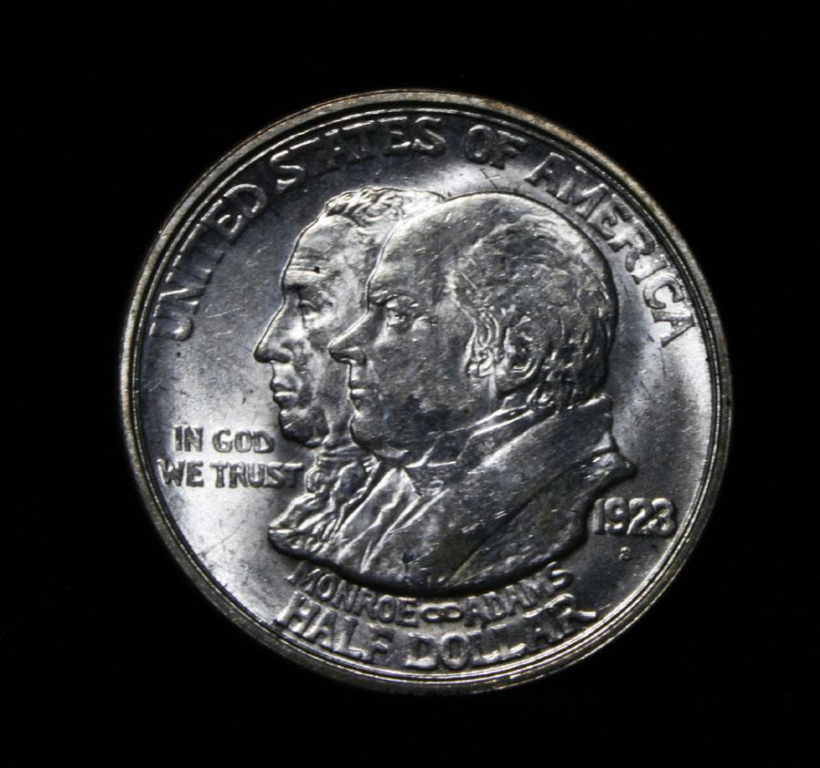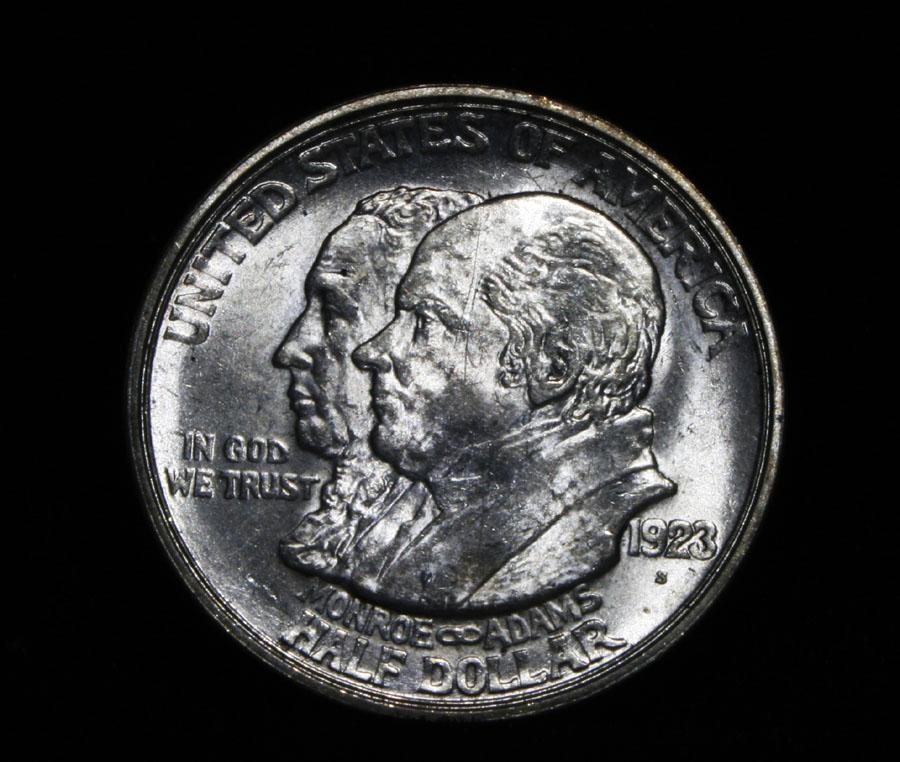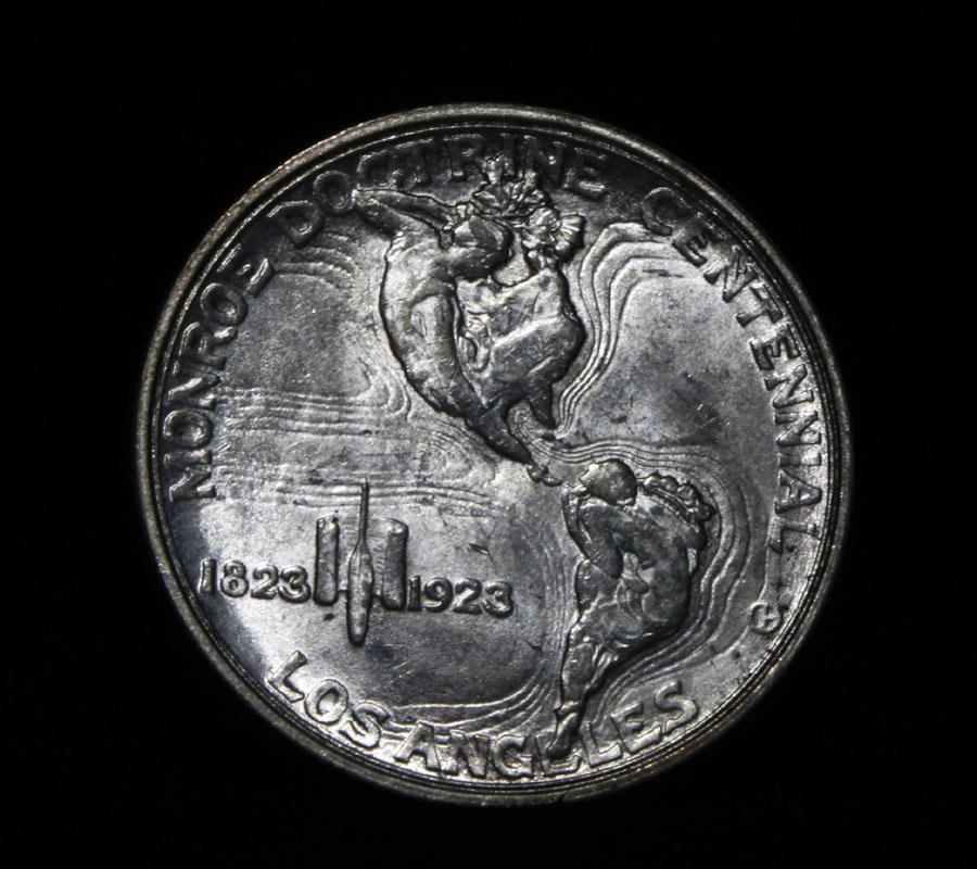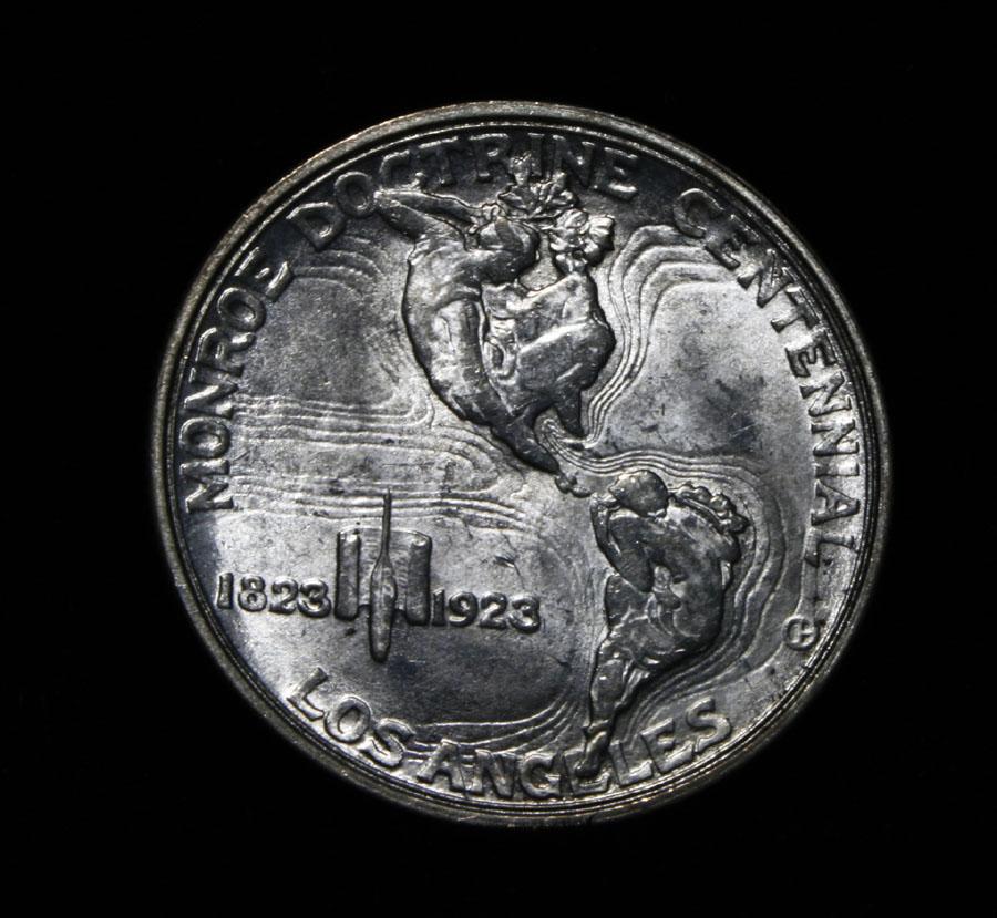 A beautiful PQ example, with great luster and a nice strike. One may think that the reverse is the two continents of The western Hemisphere but upon closer examination you will see that they are two women bent into the general shapes of the two continents. When examining a Monroe Commemorative the cheeks of the two statesmen on the obverse and the figures that represent the two continents on the reverse are the highpoints and will show wear first. Coin World's Coin Values lists ms64 at $450 and ms65 at $2100 and The Wholesale Greysheet lists ms64 at $300 and ms65 at $1450. Estimated Value $400