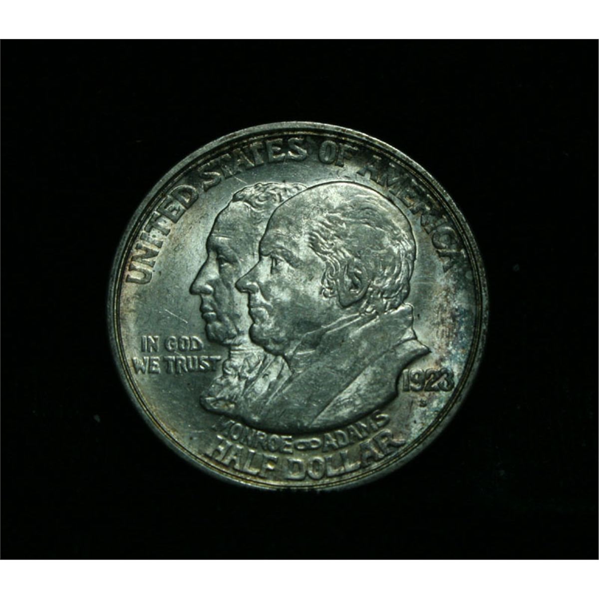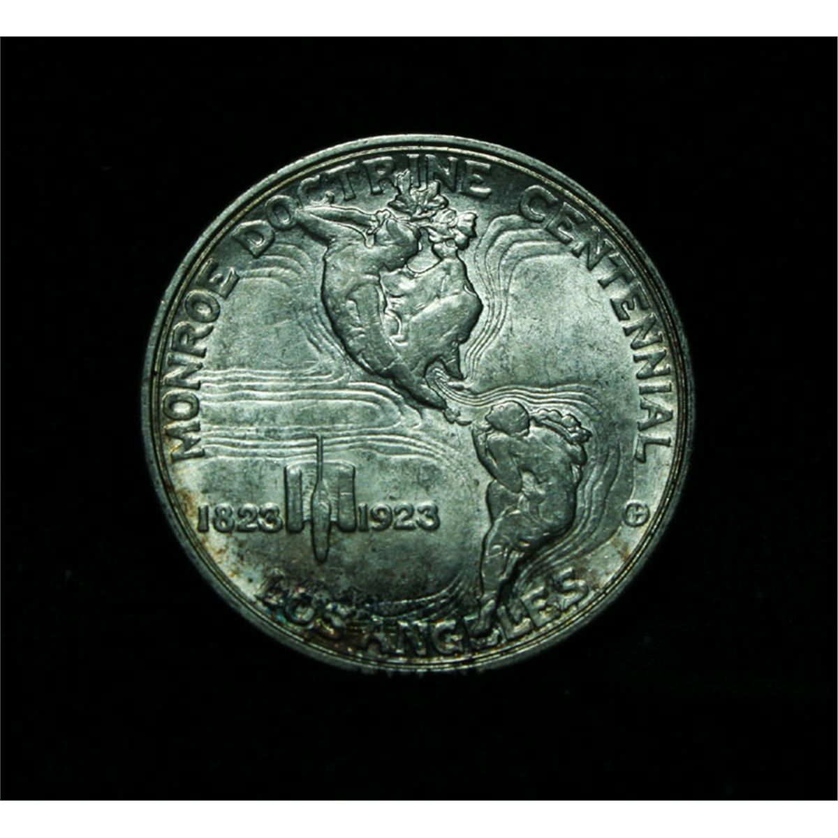 A Nice Example with a bit of rim toning. One may think that the reverse is the two continents of The western Hemisphere but upon closer examination you will see that they are two women bent into the general shapes of the two continents. When examining a Monroe Commemorative the cheeks of the two statesmen on the obverse and the figures that represent the two continents on the reverse are the highpoints and will show wear first. Coin World's Coin Values lists ms63 at $140. PCGS's Price Guide lists an ms63 at $160. The Wholesale Greysheet lists ms63 at $95. Estimated Value $125