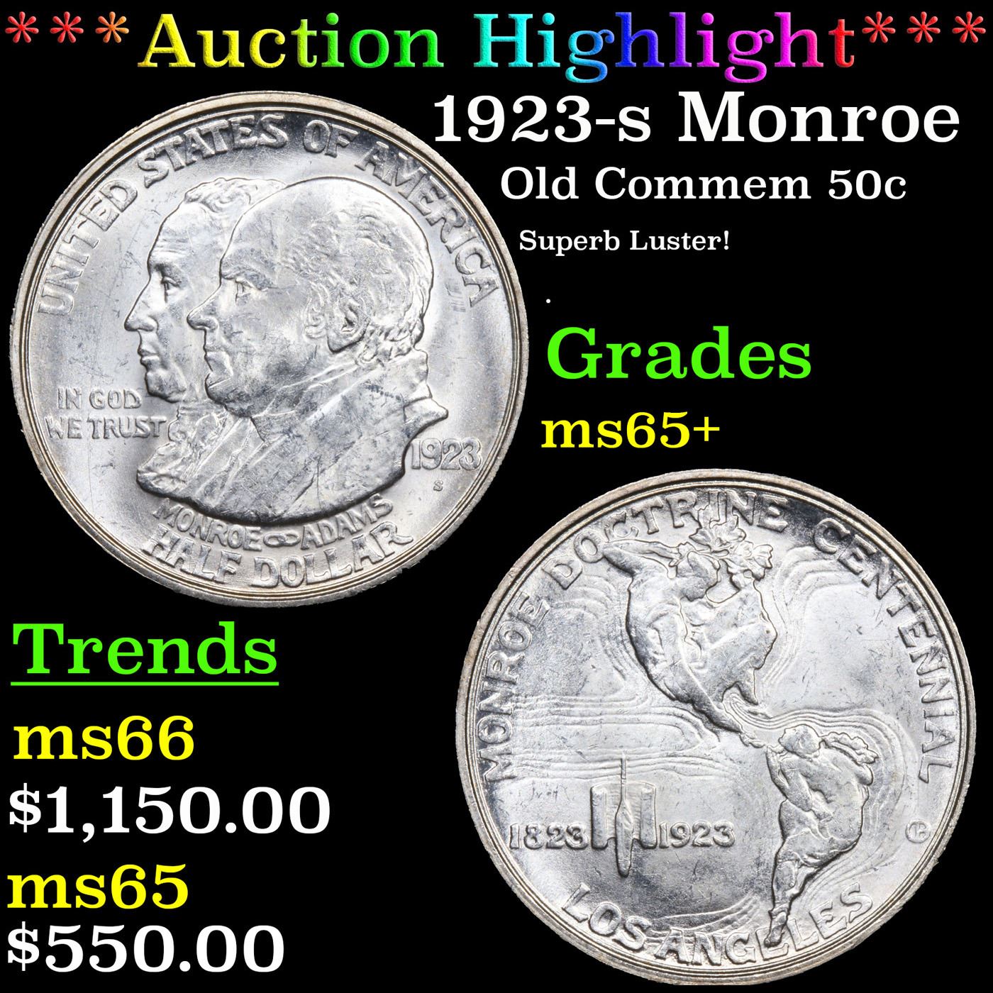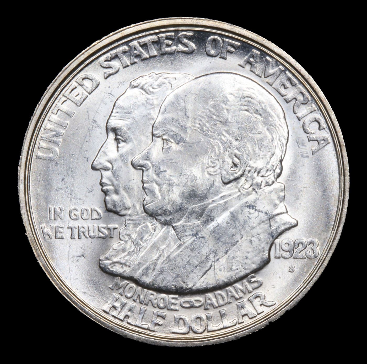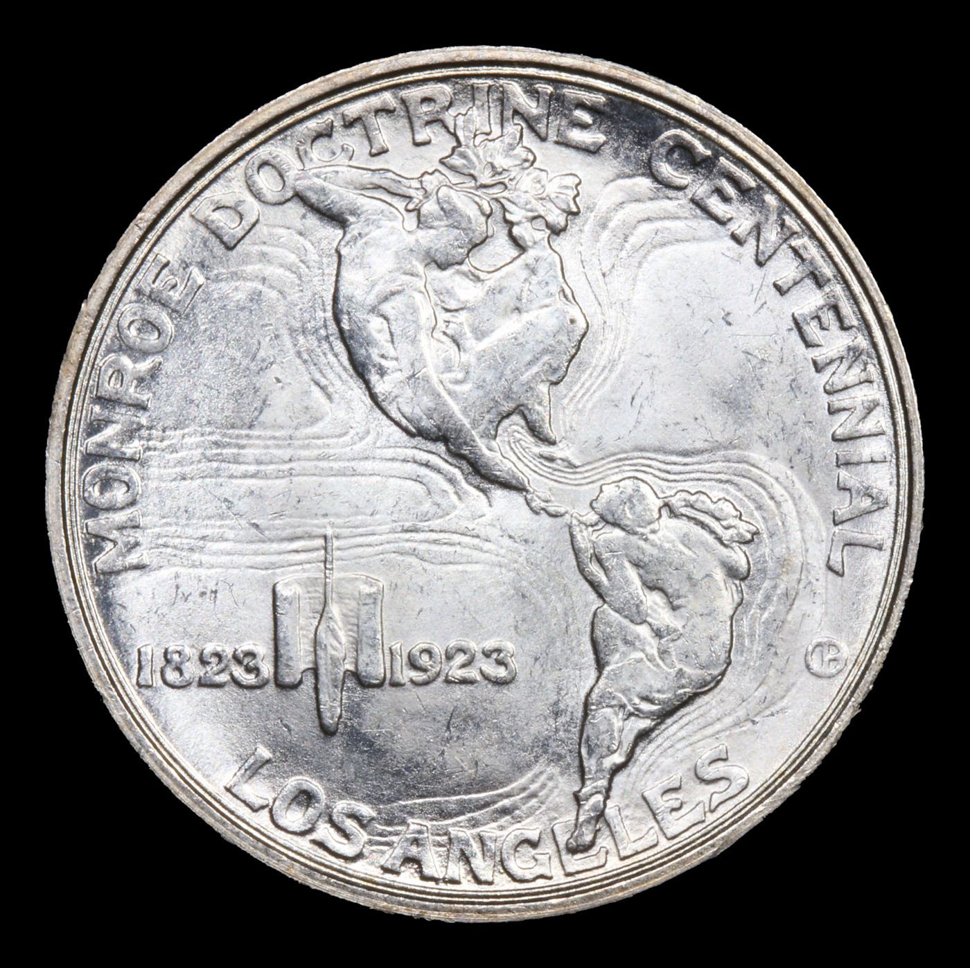 1923-s Monroe Old Commem Half Dollar 50c Graded GEM+ Unc BY USCG. One may think that the Reverse of the Two Continents of The Western Hemisphere but upon closer examination you will see that they are two women bent into the general shapes of the two continents. When examining a Monroe Commemorative the cheeks of the two statesmen on the obverse and the figures that represent the two continents on the reverse are the highpoints and will show wear first.