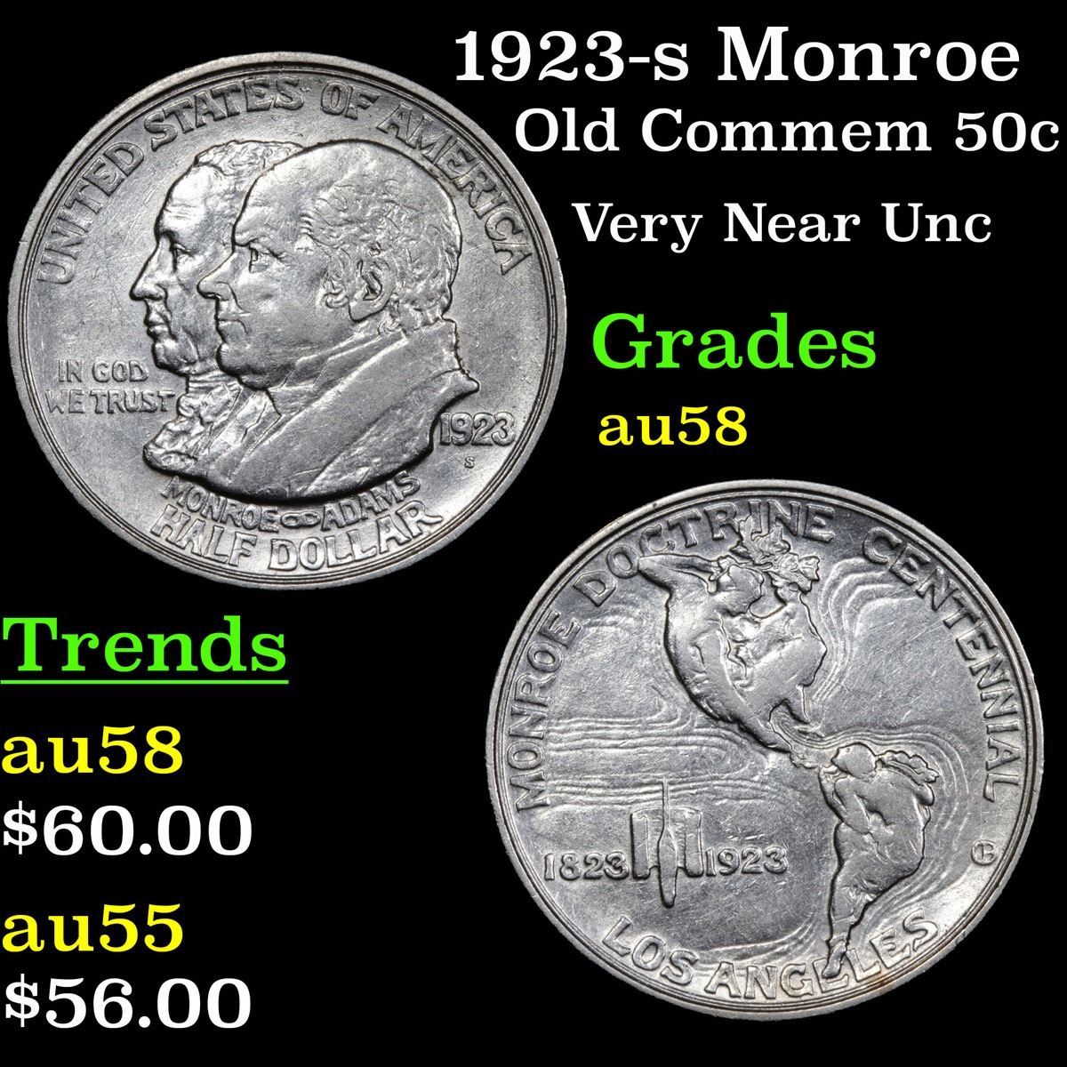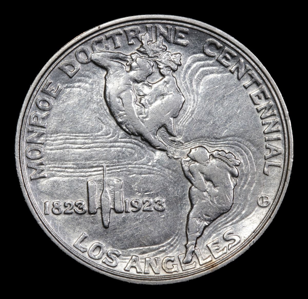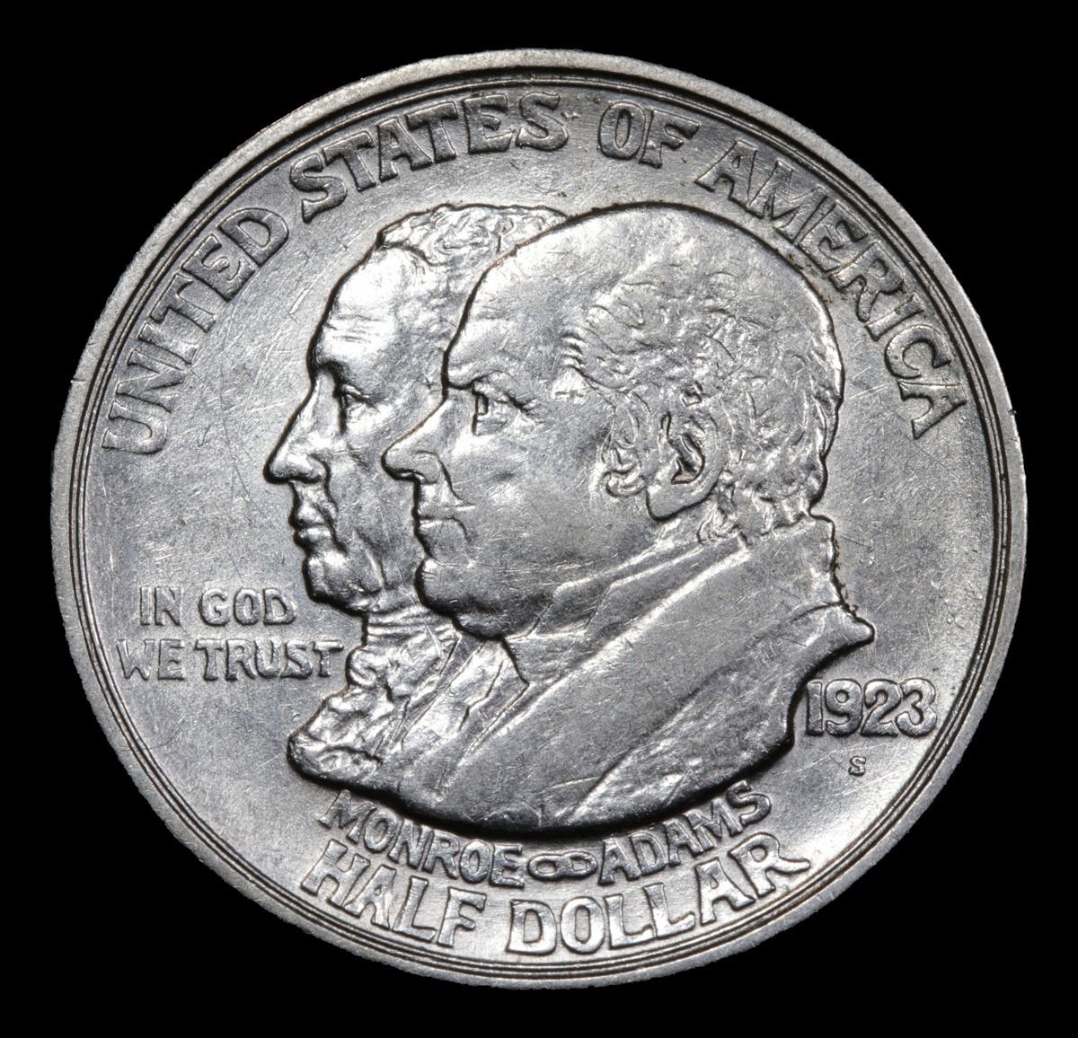 1923-s Monroe . Very Near Unc Old Commem Half Dollar 50c Grades Choice AU/BU Slider. One may think that the Reverse of the Two Continents of The Western Hemisphere but upon closer examination you will see that they are two women bent into the general shapes of the two continents. When examining a Monroe Commemorative the cheeks of the two statesmen on the obverse and the figures that represent the two continents on the reverse are the highpoints and will show wear first.