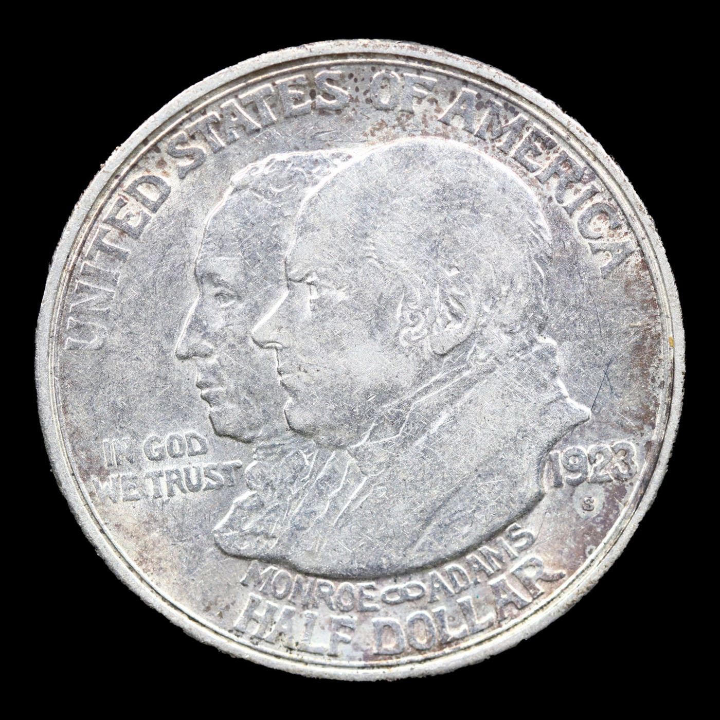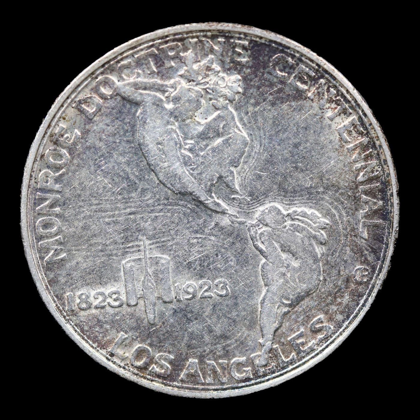 1923-s Monroe Old Commem Half Dollar 50c Grades Choice AU. One may think that the Reverse of the Two Continents of The Western Hemisphere but upon closer examination you will see that they are two women bent into the general shapes of the two continents. When examining a Monroe Commemorative the cheeks of the two statesmen on the obverse and the figures that represent the two continents on the reverse are the highpoints and will show wear first.
