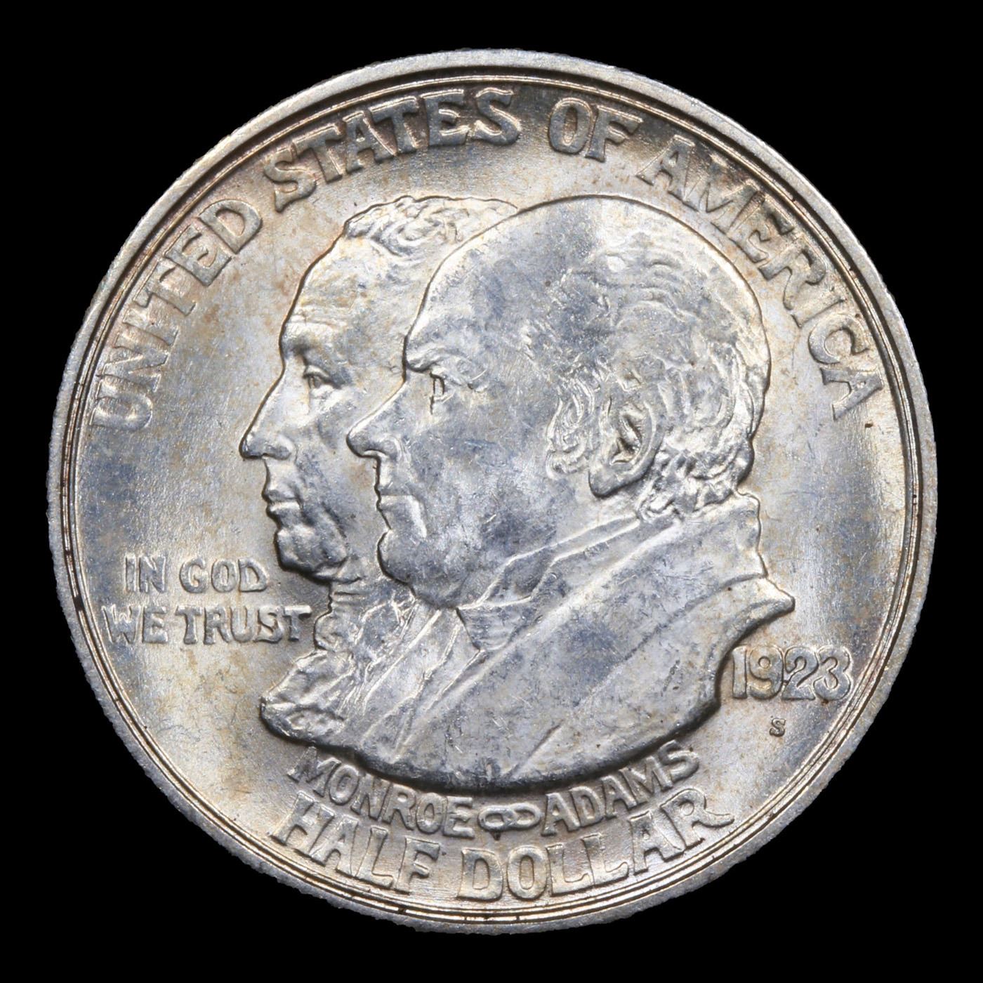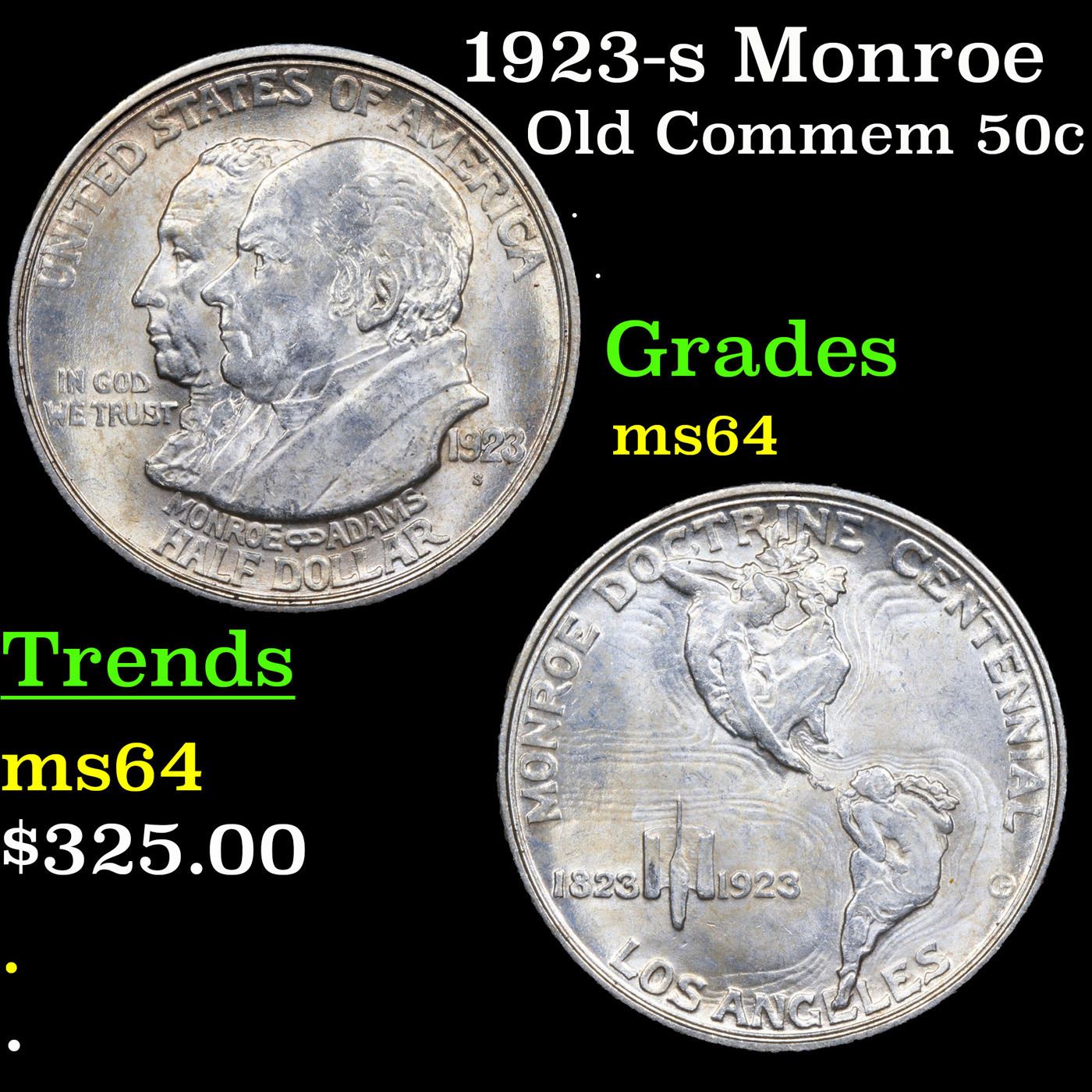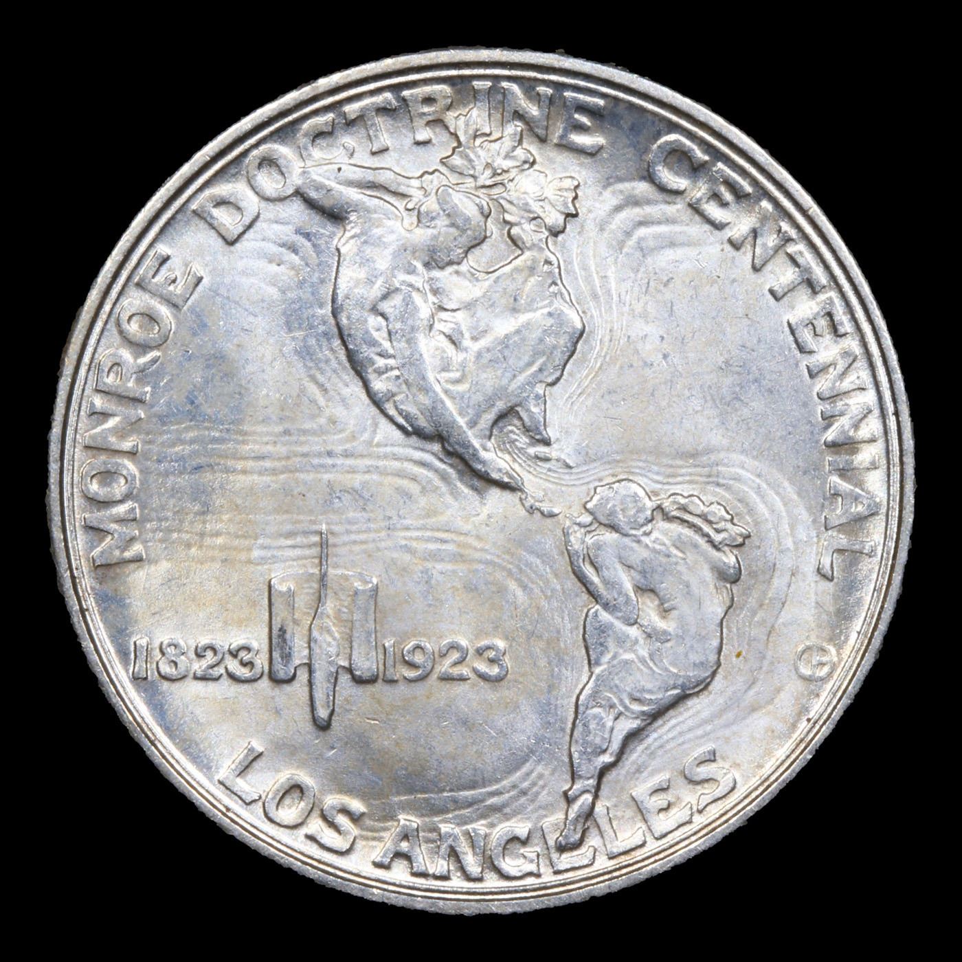 1923-s Monroe Old Commem Half Dollar 50c Grades Choice Unc. One may think that the Reverse of the Two Continents of The Western Hemisphere but upon closer examination you will see that they are two women bent into the general shapes of the two continents. When examining a Monroe Commemorative the cheeks of the two statesmen on the obverse and the figures that represent the two continents on the reverse are the highpoints and will show wear first.