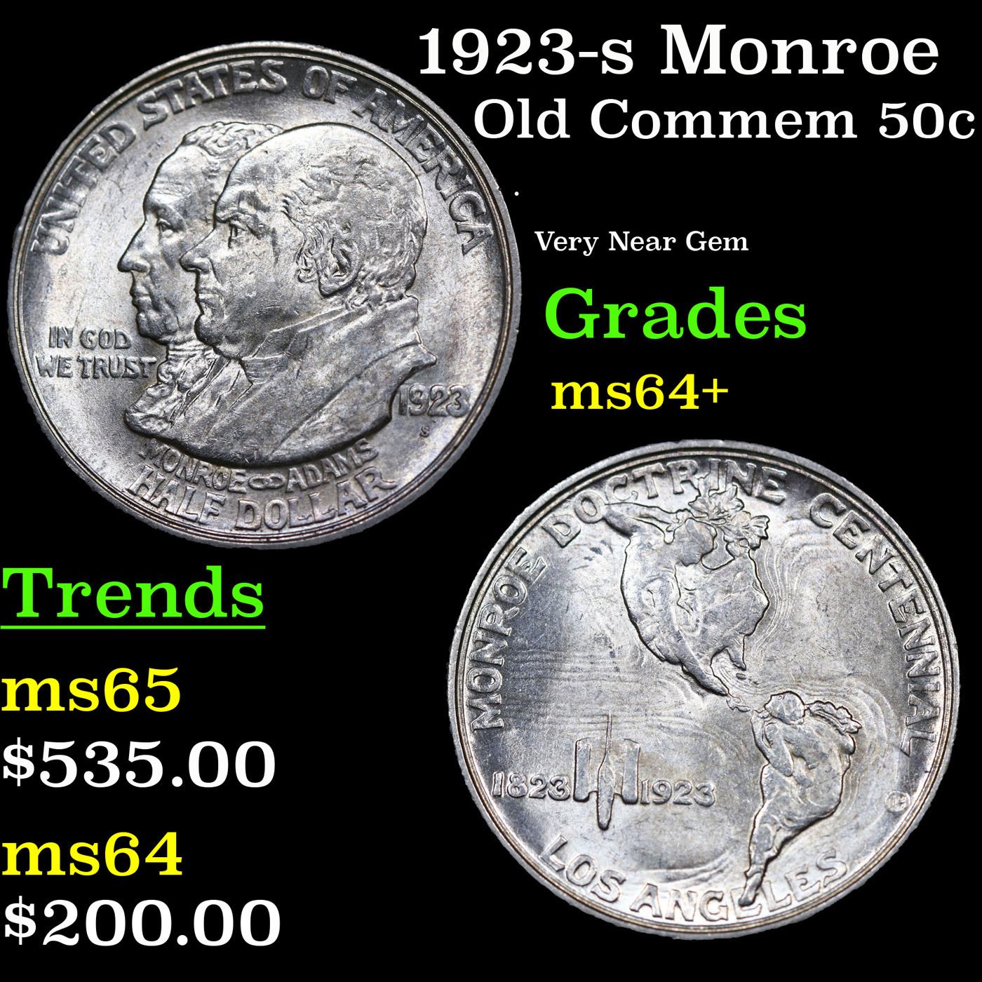 1923-s Monroe Old Commem Half Dollar 50c Grades Choice+ Unc. One may think that the Reverse of the Two Continents of The Western Hemisphere but upon closer examination you will see that they are two women bent into the general shapes of the two continents. When examining a Monroe Commemorative the cheeks of the two statesmen on the obverse and the figures that represent the two continents on the reverse are the highpoints and will show wear first.