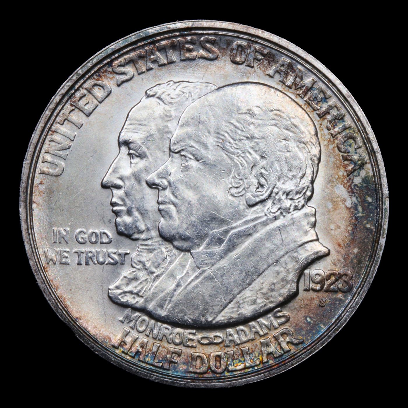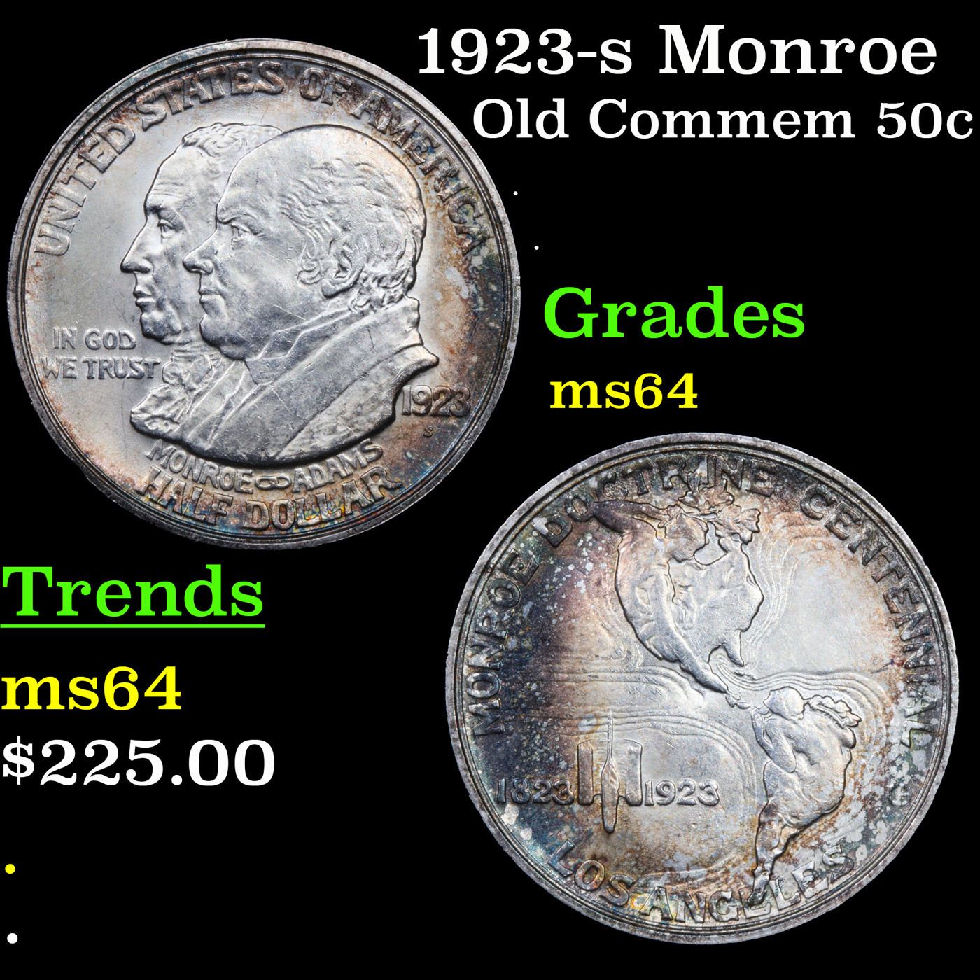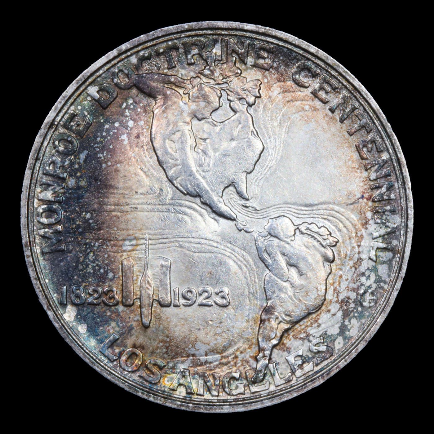 1923-s Monroe Old Commem Half Dollar 50c Grades Choice Unc. One may think that the Reverse of the Two Continents of The Western Hemisphere but upon closer examination you will see that they are two women bent into the general shapes of the two continents. When examining a Monroe Commemorative the cheeks of the two statesmen on the obverse and the figures that represent the two continents on the reverse are the highpoints and will show wear first.