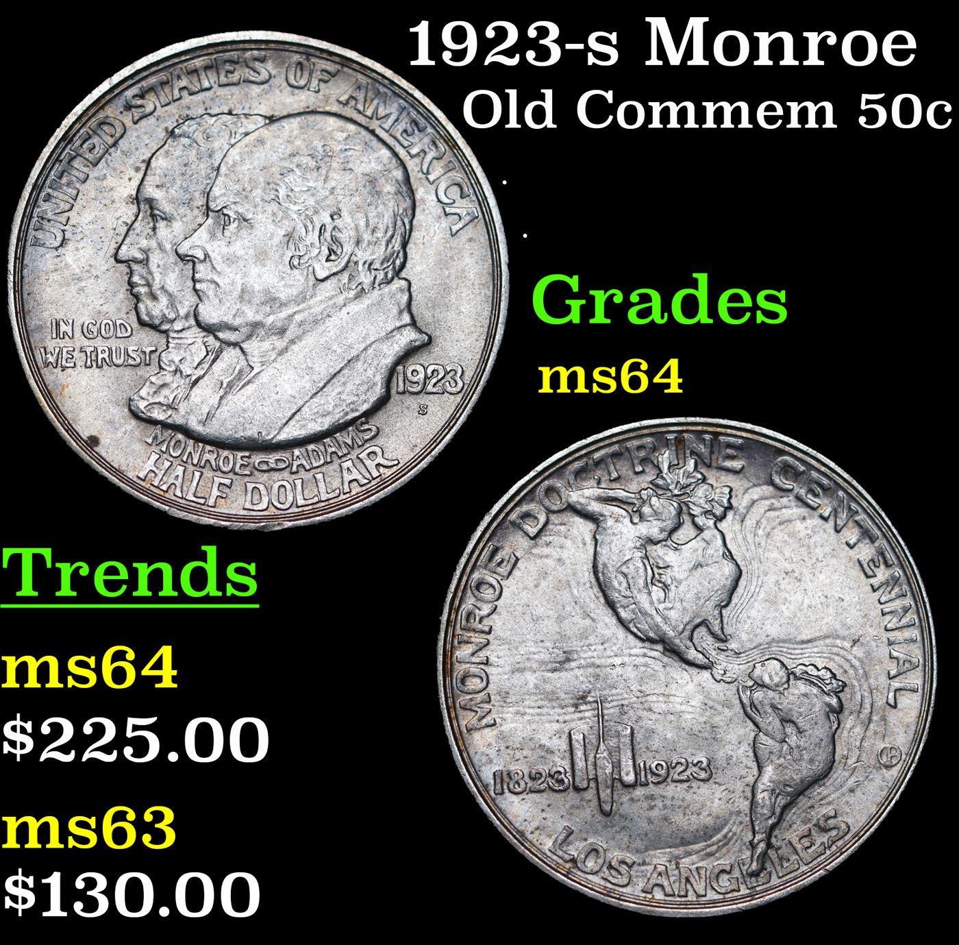 1923-s Monroe Old Commem Half Dollar 50c Grades Choice Unc. One may think that the Reverse of the Two Continents of The Western Hemisphere but upon closer examination you will see that they are two women bent into the general shapes of the two continents. When examining a Monroe Commemorative the cheeks of the two statesmen on the obverse and the figures that represent the two continents on the reverse are the highpoints and will show wear first.
