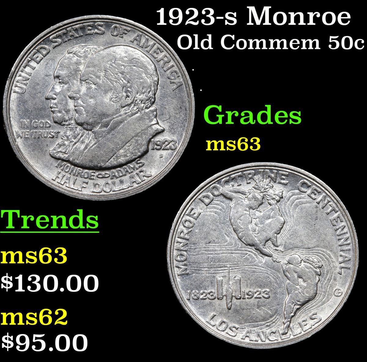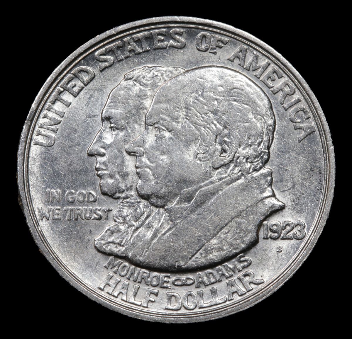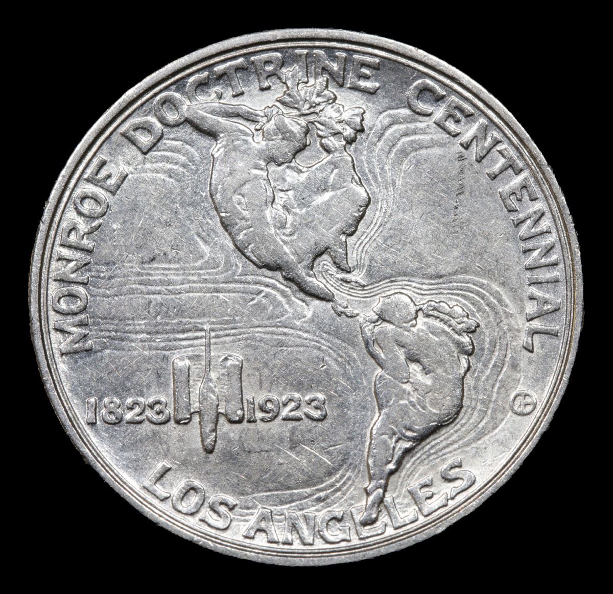 1923-s Monroe . . Old Commem Half Dollar 50c Grades Select Unc. One may think that the Reverse of the Two Continents of The Western Hemisphere but upon closer examination you will see that they are two women bent into the general shapes of the two continents. When examining a Monroe Commemorative the cheeks of the two statesmen on the obverse and the figures that represent the two continents on the reverse are the highpoints and will show wear first.