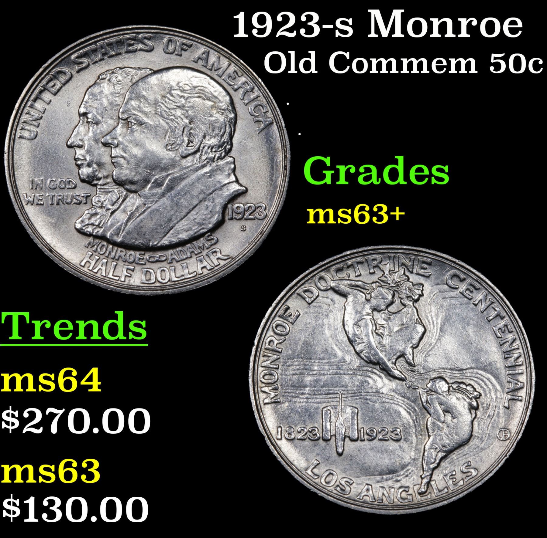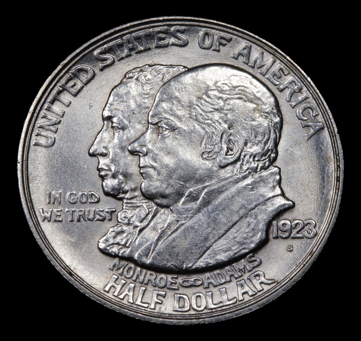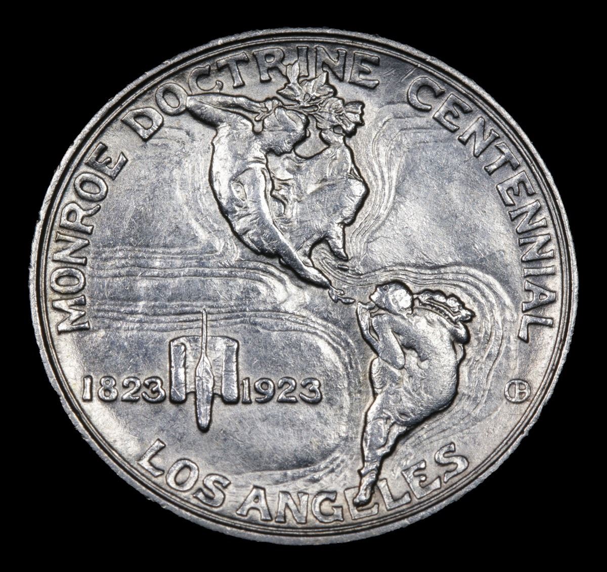 1923-s Monroe . . Old Commem Half Dollar 50c Grades Select+ Unc. One may think that the Reverse of the Two Continents of The Western Hemisphere but upon closer examination you will see that they are two women bent into the general shapes of the two continents. When examining a Monroe Commemorative the cheeks of the two statesmen on the obverse and the figures that represent the two continents on the reverse are the highpoints and will show wear first.