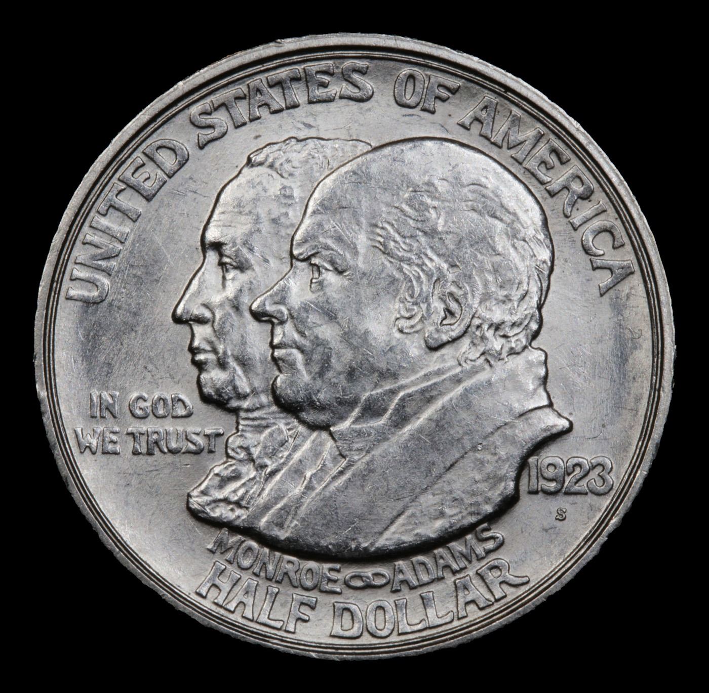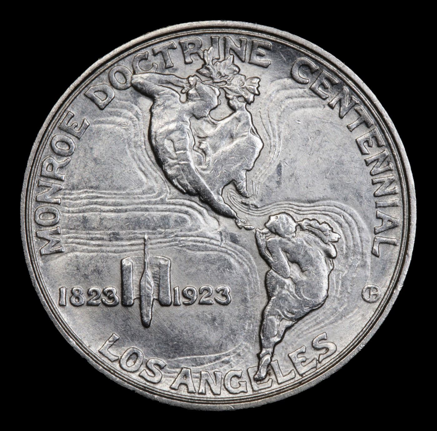 1923-s Monroe Old Commem Half Dollar 50c Grades Select Unc. One may think that the Reverse of the Two Continents of The Western Hemisphere but upon closer examination you will see that they are two women bent into the general shapes of the two continents. When examining a Monroe Commemorative the cheeks of the two statesmen on the obverse and the figures that represent the two continents on the reverse are the highpoints and will show wear first.