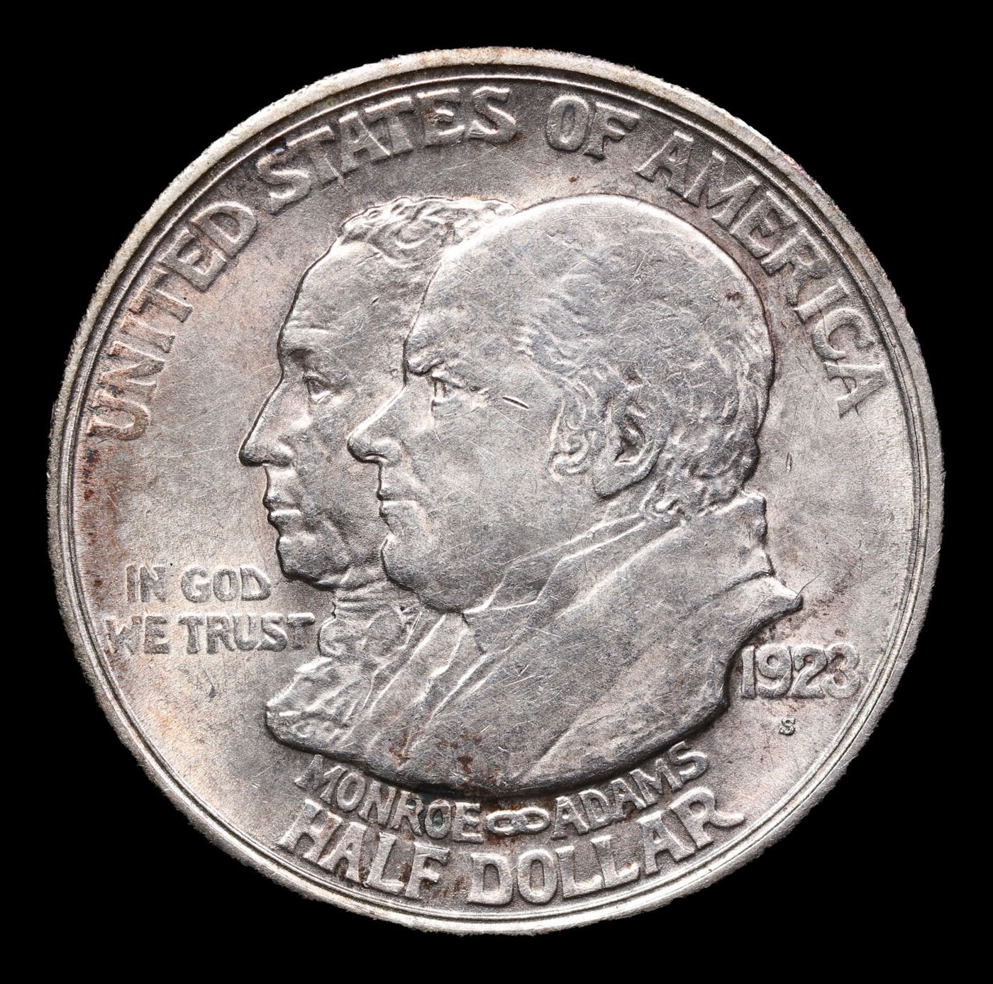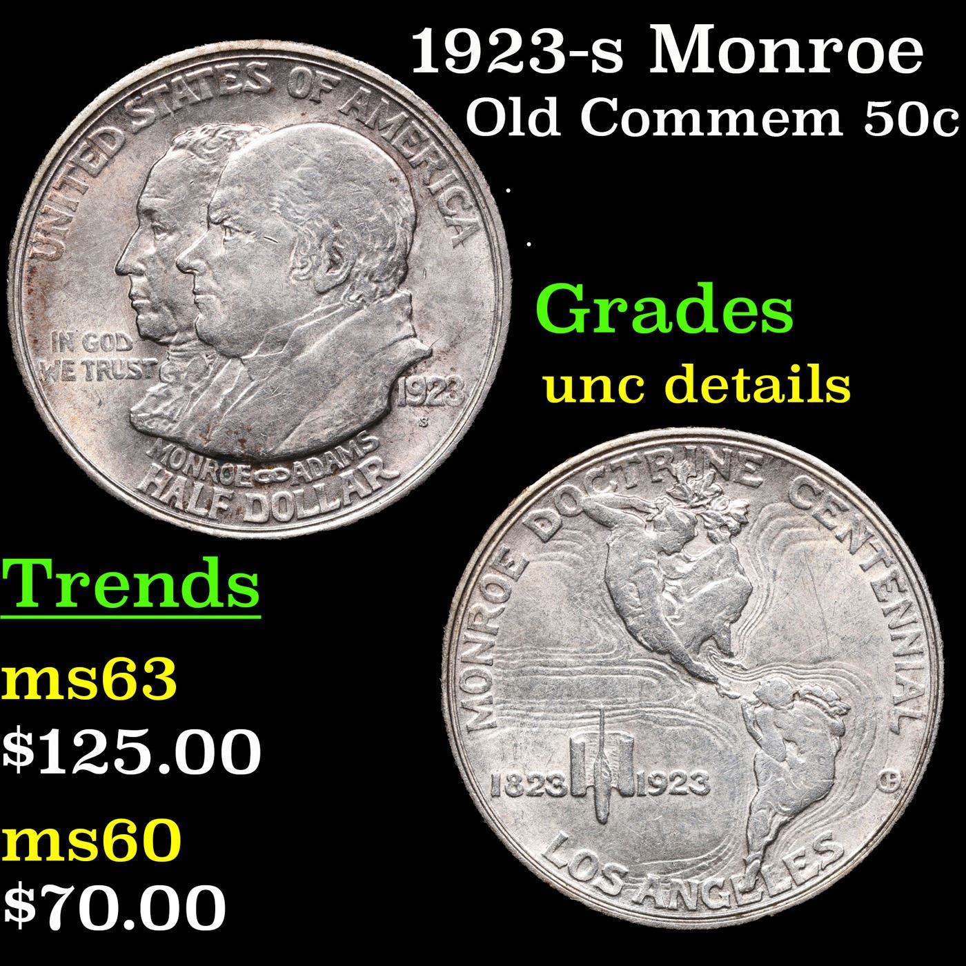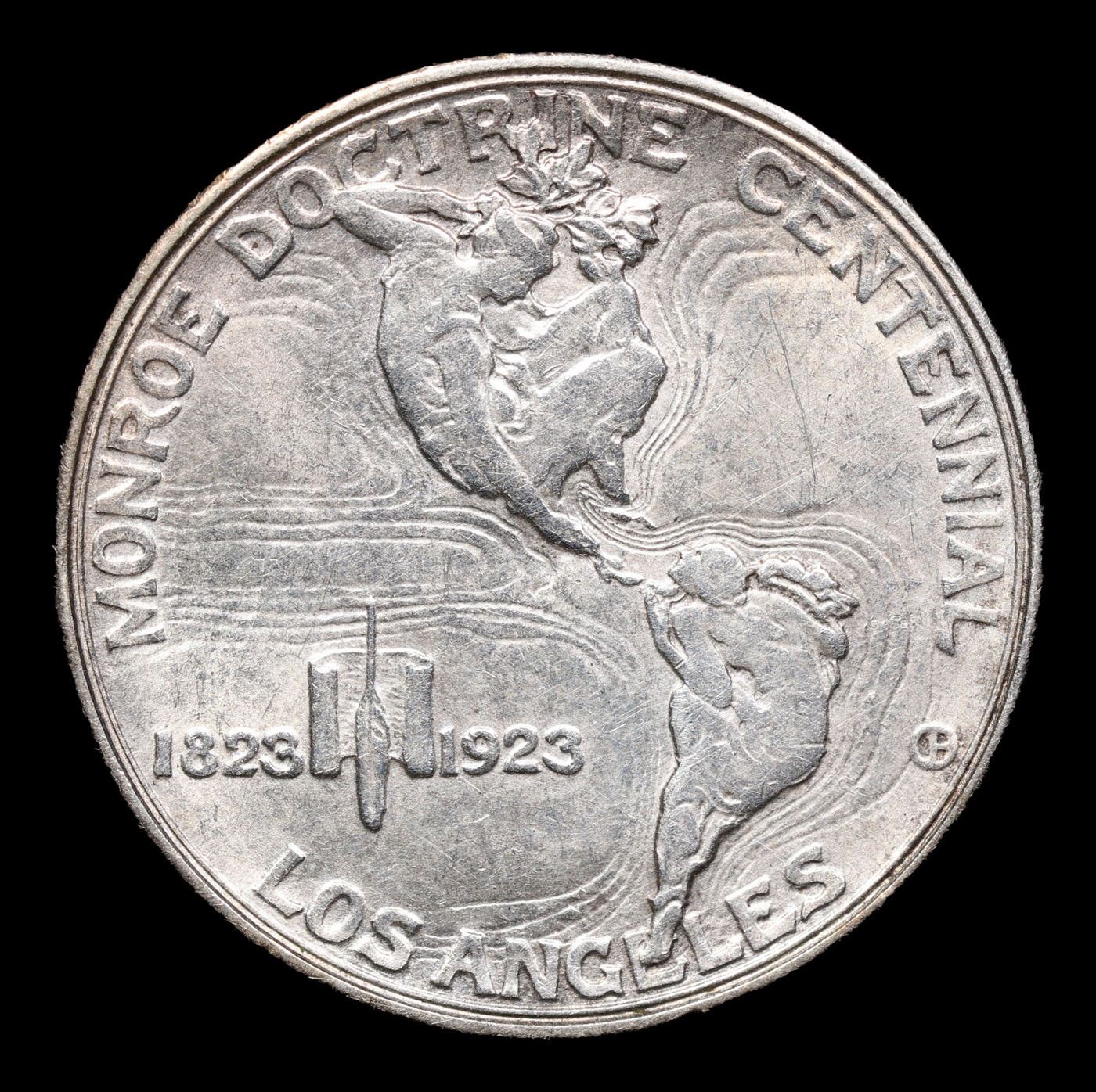1923-s Monroe Old Commem Half Dollar 50c Grades Unc Details. One may think that the Reverse of the Two Continents of The Western Hemisphere but upon closer examination you will see that they are two women bent into the general shapes of the two continents. When examining a Monroe Commemorative the cheeks of the two statesmen on the obverse and the figures that represent the two continents on the reverse are the highpoints and will show wear first.