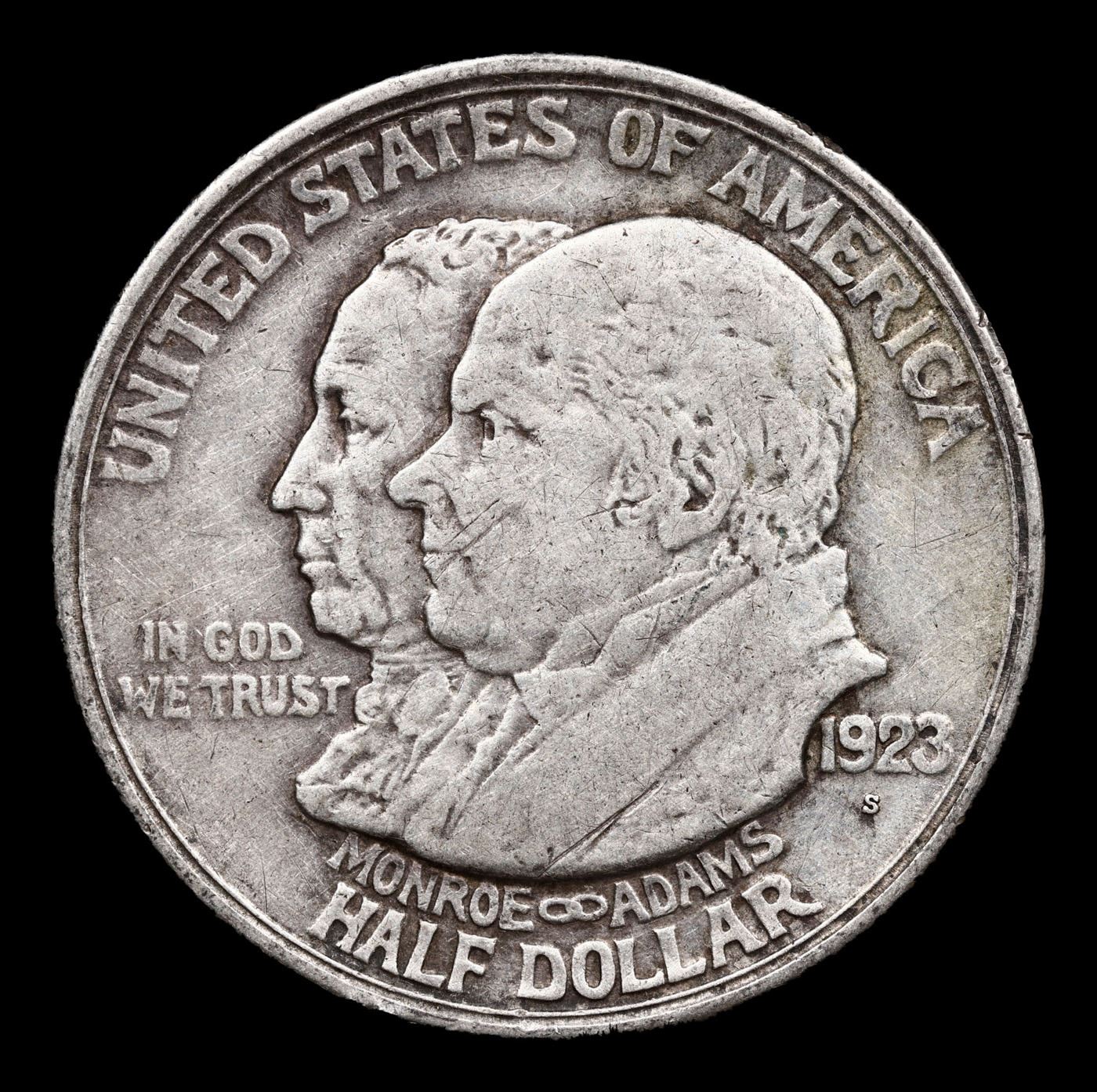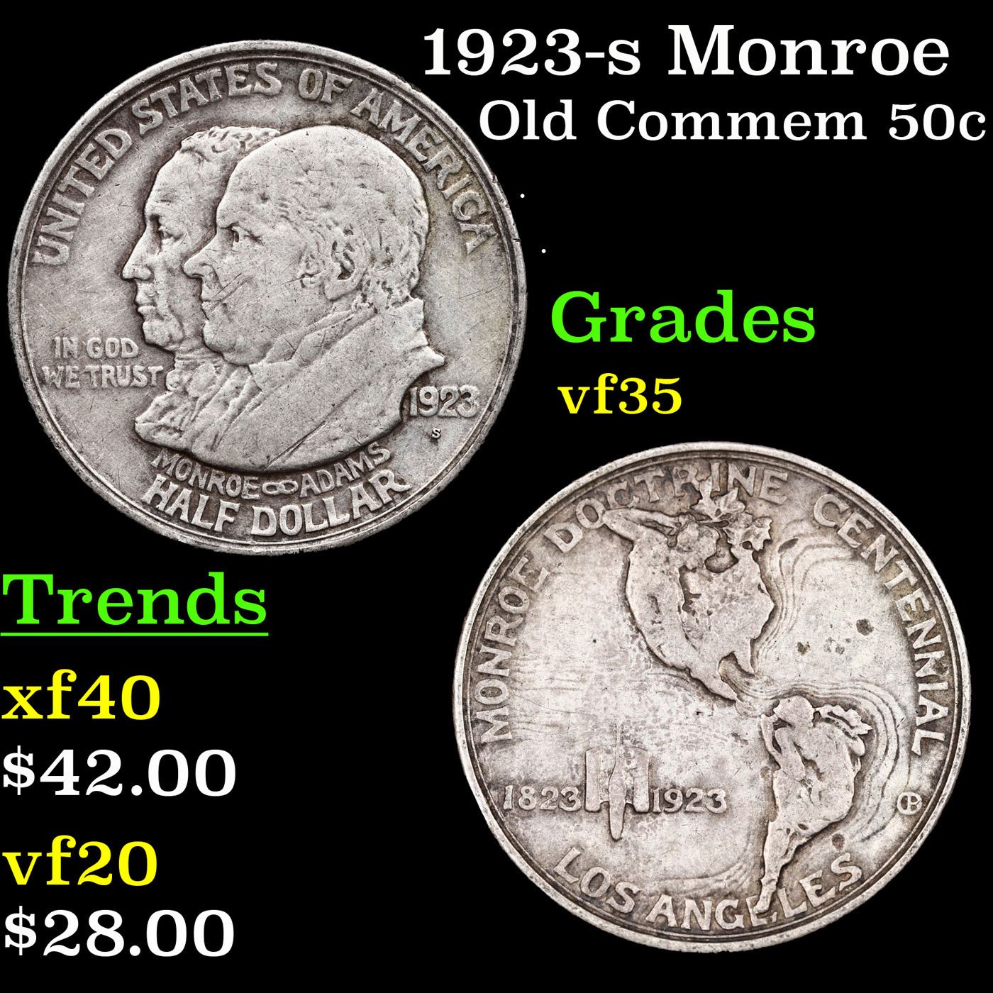 1923-s Monroe Old Commem Half Dollar 50c Grades vf++. One may think that the Reverse of the Two Continents of The Western Hemisphere but upon closer examination you will see that they are two women bent into the general shapes of the two continents. When examining a Monroe Commemorative the cheeks of the two statesmen on the obverse and the figures that represent the two continents on the reverse are the highpoints and will show wear first.