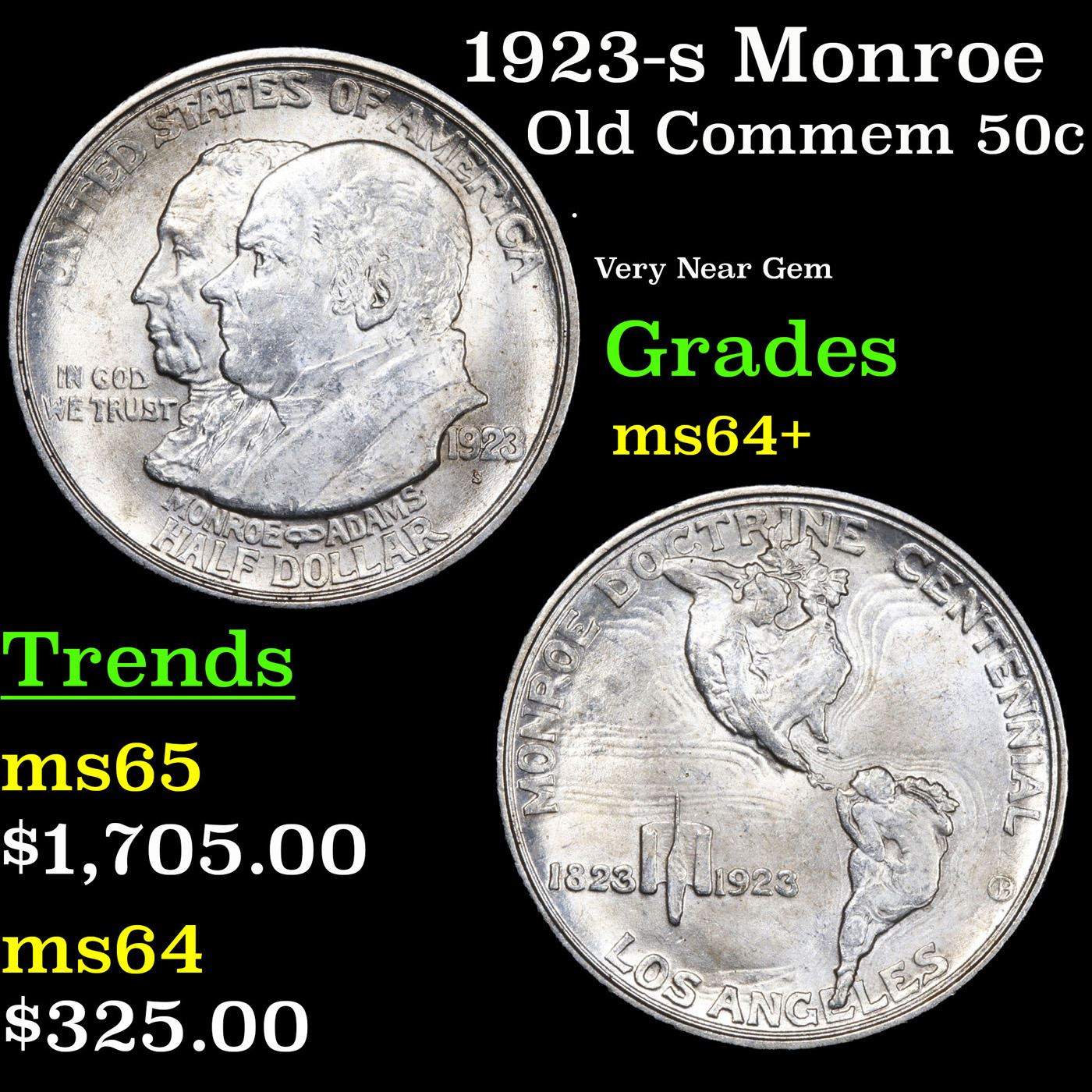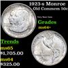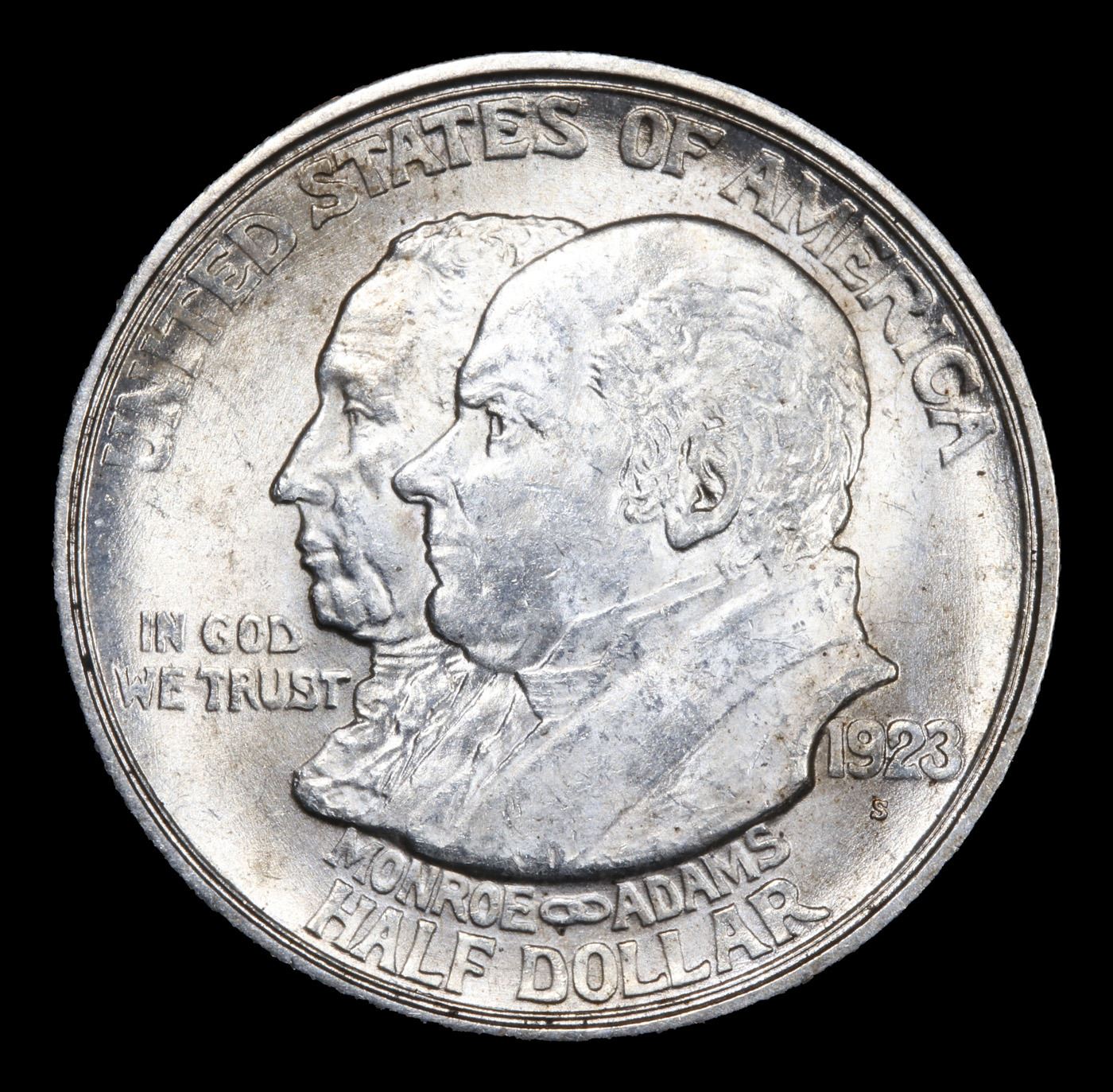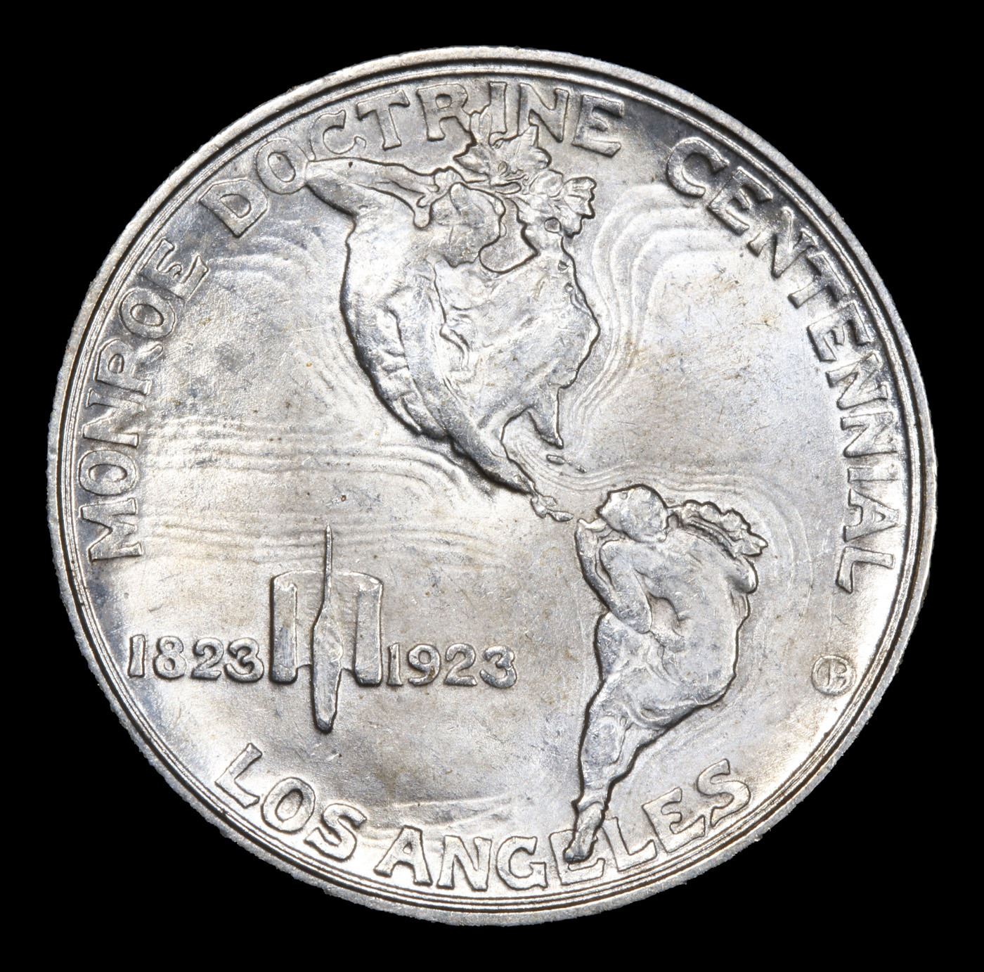 1923-s Monroe Old Commem Half Dollar 50c grades select+ unc. One may think that the Reverse of the Two Continents of The Western Hemisphere but upon closer examination you will see that they are two women bent into the general shapes of the two continents. When examining a Monroe Commemorative the cheeks of the two statesmen on the obverse and the figures that represent the two continents on the reverse are the highpoints and will show wear first. 0