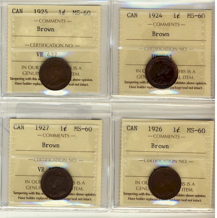 1924 1¢, 1925, 1926 & 1927 ICCS MS60 BN. Lot of 4 coins.
