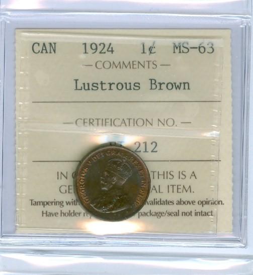 1924 1¢ ICCS MS63 Lustrous Brown. Key date example in mint condition.