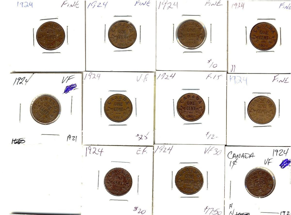 1924 1¢. Lot of 11 key date cents. G+ to VF.