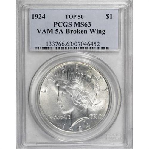 <B>1924 $1 MS63 PCGS.</B></I> VAM-5A. Broken Wing. Top 50. PCGS Population (5186/10805). NGC Census: (4799/19110). Mintage: 11,811,000. Numismedia Wsl. Price for NGC/PCGS coin in MS63: $31. (#7363)<BR><BR><B>Coin Engraver:</B> Anthony de Francisci<BR><BR><b>Shipping:</b> Coins & Currency (<a target="_blank" href="http://www.heritageauctions.com/common/shipping.php">view shipping information</a>)