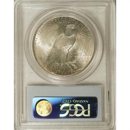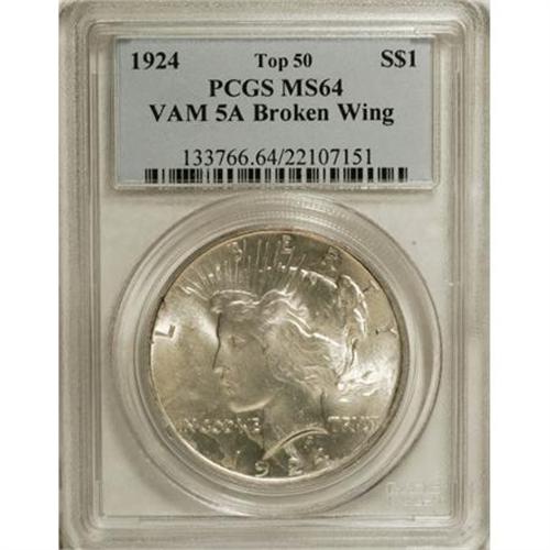 <B>1924 $1 MS64 PCGS.</B></I> VAM-5A. A Top 50 Variety. The "Broken Wing" variety for the year, with a prominent die crack that runs through most of the eagle's wing. Swirls of milky patina appear at the margins of this strongly lustrous, solidly struck near-Gem. Population: 8 in 64, 0 finer (4/07).<BR><BR><b>Shipping:</b> Coins & Currency (<a target="_blank" href="http://www.heritageauctions.com/common/shipping.php">view shipping information</a>)