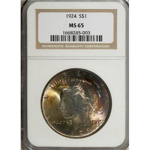 <B>1924 $1 MS65 NGC.</B></I> A lovely specimen with full frosty mint luster beneath attractive and unusual iridescent toning. This coin has a very high degree of overall eye appeal, especially for a Peace dollar. <BR><BR><B>Coin Engraver:</B> Anthony de Francisci<BR><BR><b>Shipping:</b> Coins & Currency (<a target="_blank" href="http://www.heritageauctions.com/common/shipping.php">view shipping information</a>)