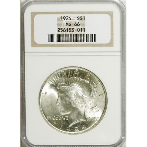 <B>1924 $1 MS66 NGC.</B></I> NGC Census: (831/56). PCGS Population (417/22). Mintage: 11,811,000. Numismedia Wsl. Price for NGC/PCGS coin in MS66: $610. (#7363)<BR><BR><b>Shipping:</b> Coins & Currency (<a target="_blank" href="http://www.heritageauctions.com/common/shipping.php">view shipping information</a>)