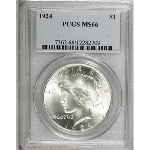 <B>1924 $1 MS66 PCGS.</B></I> . PCGS Population (437/22). NGC Census: (877/64). Mintage: 11,811,000. Numismedia Wsl. Price for NGC/PCGS coin in MS66: $580. (#7363)<BR><BR><B>Coin Engraver:</B> Anthony de Francisci<BR><BR><b>Shipping:</b> Coins & Currency (<a target="_blank" href="http://www.heritageauctions.com/common/shipping.php">view shipping information</a>)