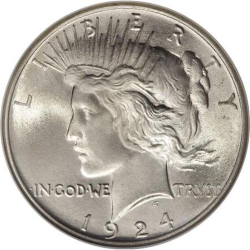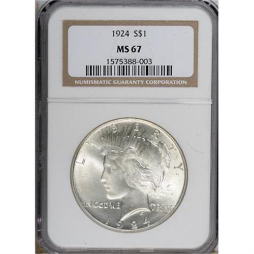 <B>1924 $1 MS67 NGC.</B></I> An exemplary Peace dollar that would make an excellent type coin. The surfaces are heavily frosted and brilliant on each side, and the strike is full in the centers. There must be abrasions on this piece somewhere, but examination with the unaided eye fails to reveal them. Few Peace dollars have attained Superb Gem status over the 21 years the two main grading services have been in operation. Census: 59 in 67, 0 finer (5/07).<BR><BR><b>Shipping:</b> Coins & Currency (<a target="_blank" href="http://www.heritageauctions.com/common/shipping.php">view shipping information</a>)