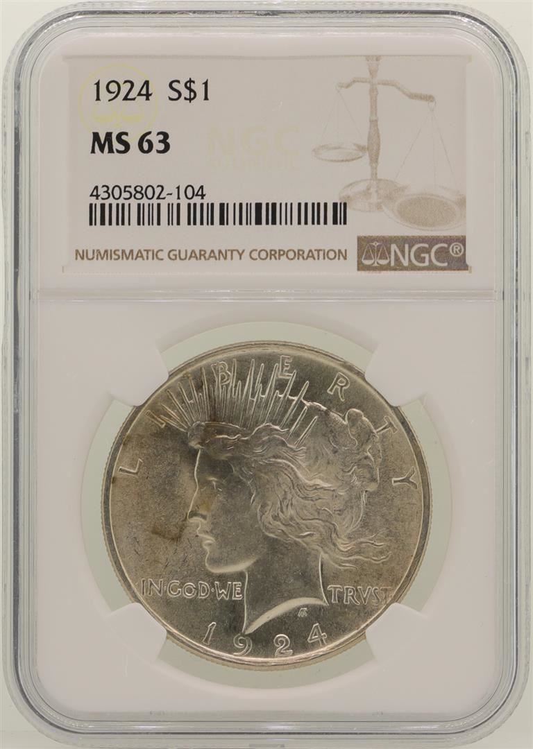 One 1924 $1 Peace Silver Dollar Coin NGC MS63. NGC Certified.