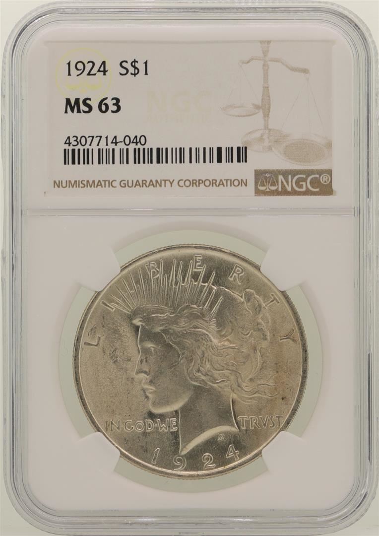One 1924 $1 Peace Silver Dollar Coin NGC MS63. NGC Certified.