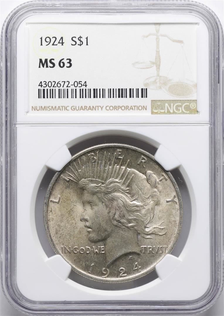 One 1924 $1 Peace Silver Dollar Coin NGC MS63. NGC Certified.
