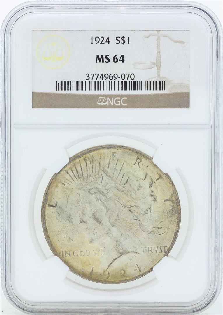 One 1924 $1 Peace Silver Dollar Coin NGC MS64. NGC Certified.