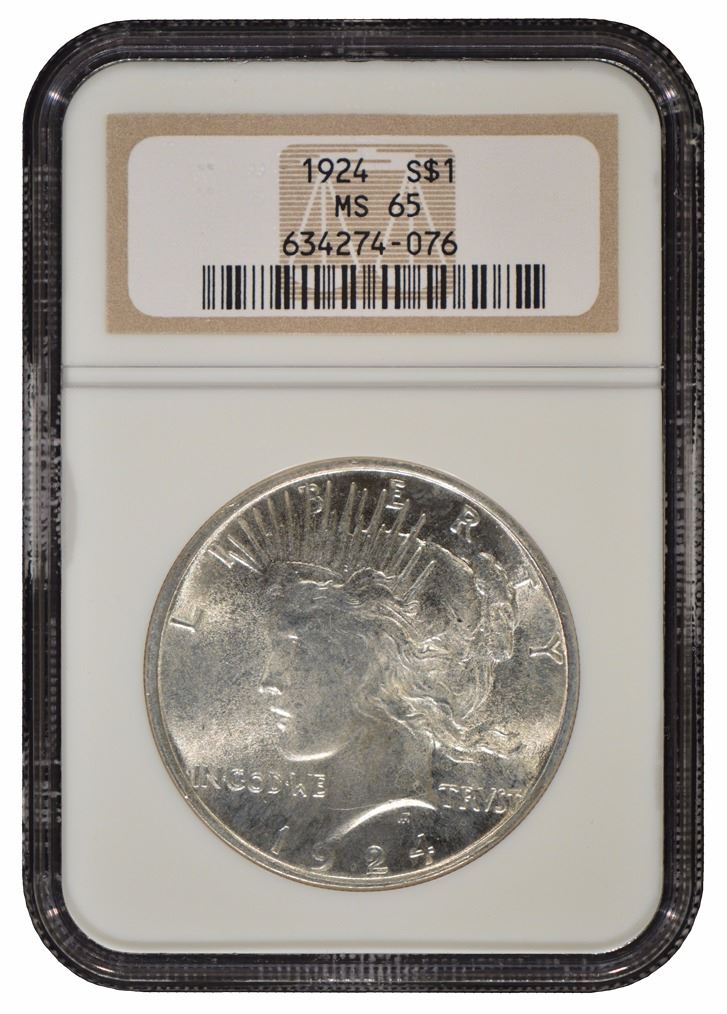 One 1924 $1 Peace Silver Dollar Coin NGC MS65.