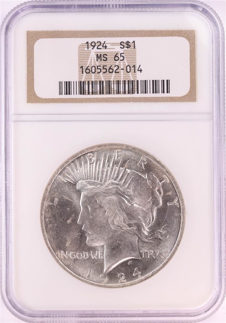 One 1924 $1 Peace Silver Dollar Coin NGC MS65. NGC Certified.