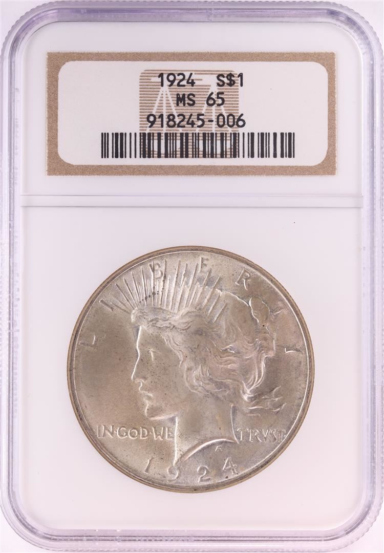 One 1924 $1 Peace Silver Dollar Coin NGC MS65. NGC Certified.