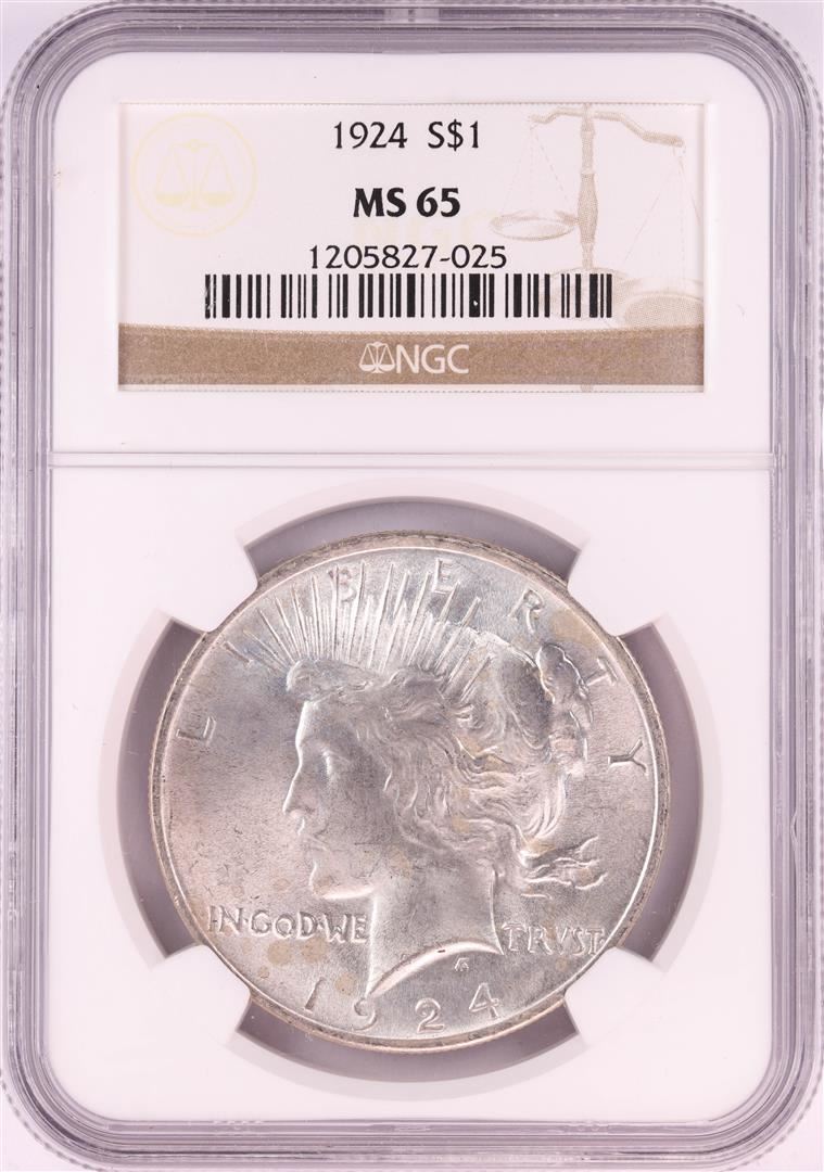 One 1924 $1 Peace Silver Dollar Coin NGC MS65. NGC Certified.