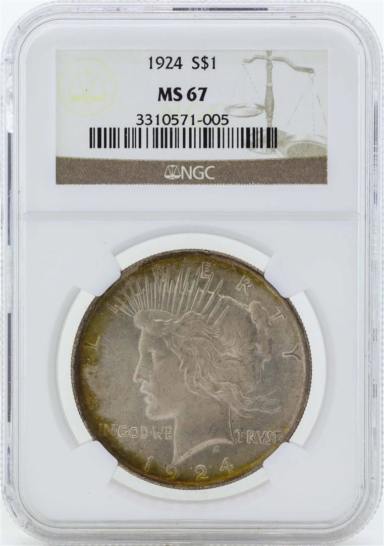 One 1924 $1 Peace Silver Dollar Coin NGC MS67. NGC Certified.