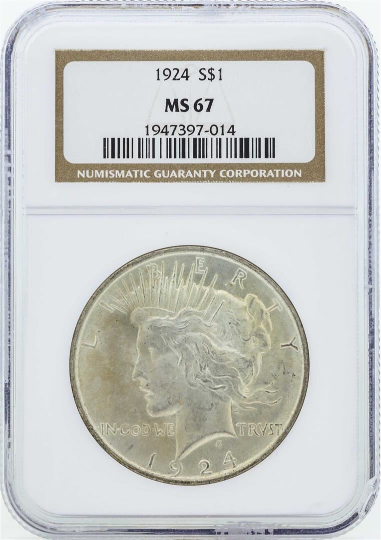 One 1924 $1 Peace Silver Dollar Coin NGC MS67. NGC Certified.