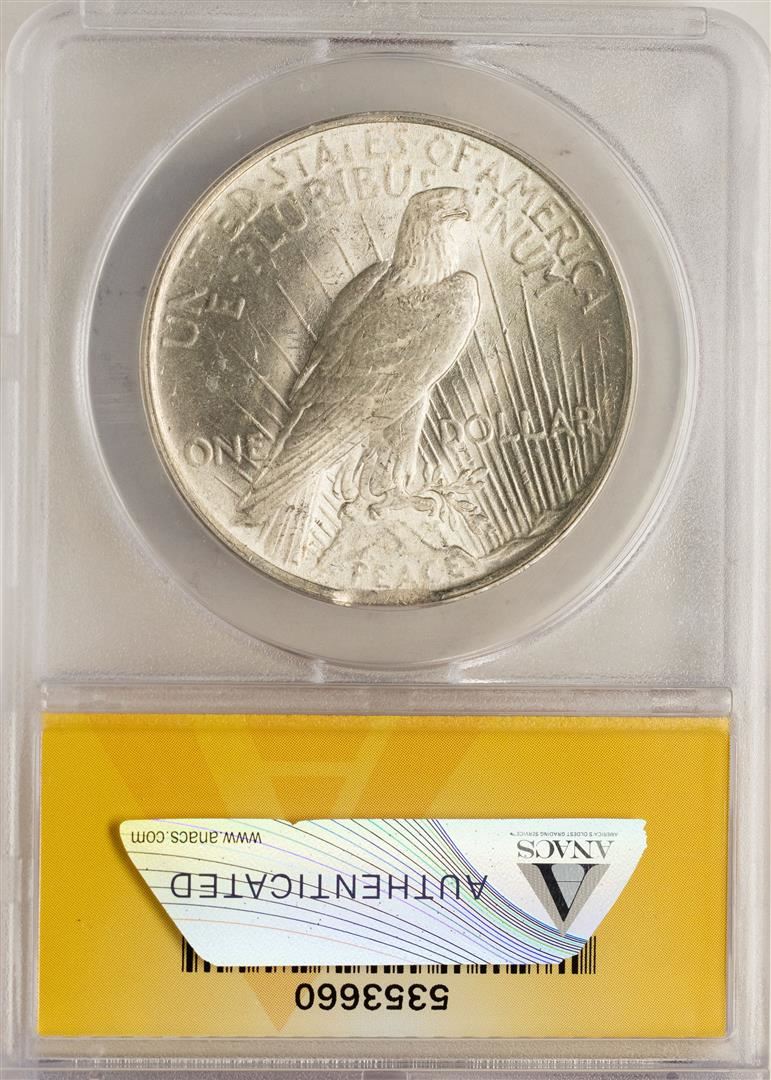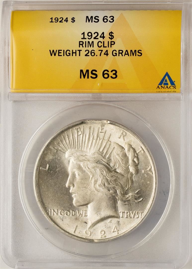 One 1924 $1 Peace Silver Dollar Coin Rim Clip ERROR ANACS MS63. ANACS Certified.