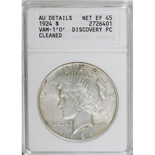 <B>1924 $1 --Cleaned--ANACS. AU Details, Net XF45.</B></I> VAM-1 '0' Discovery Piece. NGC Census: (3/24197). PCGS Population (4/17137). Mintage: 11,811,000. Numismedia Wsl. Price for NGC/PCGS coin in XF45: $13. (#7363)<BR><BR><B>Coin Engraver:</B> Anthony de Francisci<BR><BR><b>Shipping:</b> Coins & Currency (<a target="_blank" href="http://www.heritageauctions.com/common/shipping.php">view shipping information</a>)