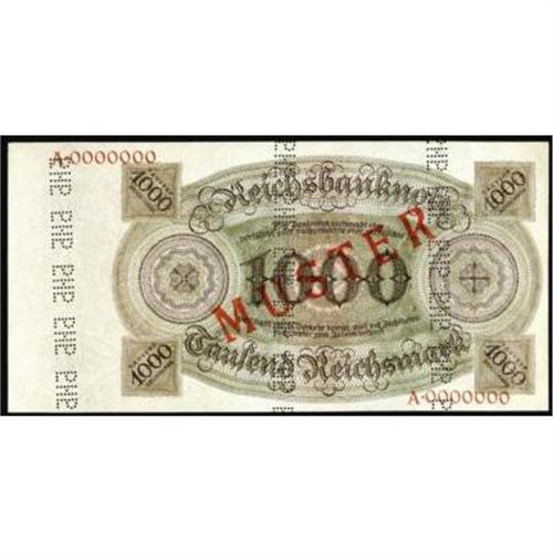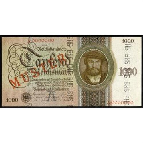 <style type="text/css"> body, td, th { font-family: Arial, Helvetica, sans-serif; font-size: 12px; color: #482424; margin: 0px; padding: 0px; } #header { background-image: url(http://www.bowersandmerena.com/ebay/images/template_v3_01.gif); clear: both; background-color: #590303; border-top-width: 2px; border-top-style: solid; border-top-color: #B38C4F; } #header #header_wrapper { height: 75px; clear: both; width: 800px; margin-right: auto; margin-left: auto; background-image: url(http://www.bowersandmerena.com/ebay/images/template_v3_03.gif); background-repeat: no-repeat; background-position: right; color: #F3EDCC; } #header #header_wrapper #header_logo { float: left; height: 75px; width: 444px; background-image: url(http://www.bowersandmerena.com/ebay/images/template_v3_02.gif); background-repeat: no-repeat; font-size: 10px; text-transform: capitalize; color: #B38C4F; } #header #header_wrapper #header_right { float: left; height: 75px; width: 356px; text-align: right; } #header #header_wrapper #header_right #headerLoginBtn { margin-bottom: 30px; } #header #header_wrapper #header_right input#txtSearch { color: #B49056; border: 1px solid #B49056; width: 175px; padding-top: 3px; padding-right: 3px; padding-bottom: 4px; padding-left: 3px; } #nav { height: 37px; background-image: url(http://www.bowersandmerena.com/ebay/images/template_v3_05.gif); clear: both; } #nav #nav_wrapper { height: 35px; width: 800px; margin-right: auto; margin-left: auto; border-left-width: 1px; border-left-style: solid; border-left-color: #B38C4F; } #nav #nav_wrapper a { padding-right: 15px; padding-left: 15px; border-right-width: 1px; border-right-style: solid; border-right-color: #B38C4F; height: 25px; padding-top: 10px; display: block; float: left; text-decoration: none; font-weight: bold; color: #5D0303; } #nav #nav_wrapper a:hover { color: #B38C4F; } #nav #nav_wrapper #search { float: right; padding-top: 7px; } #nav #nav_wrapper #search #txtSearch { font-family: Arial, Helvetica, sans-serif; font-size: 10px; text-transform: uppercase; color: #D2AE75; border: 1px solid #B38C4F; padding: 3px; } #content_bgd { background-image: url(http://www.bowersandmerena.com/ebay/images/template_v3_09.gif); background-repeat: repeat-y; background-position: center; padding-top: 15px; padding-bottom: 15px; background-color: #FBFBDB; } #content_wrapper { clear: both; height: auto; width: 800px; margin-right: auto; margin-left: auto; } .LotDetailWhite { line-height:normal; font-size:13px; font-family: arial,helvetica,sans-serif; color: White; font-weight: bold; } .LotDetailInformation { line-height:normal; font-size: 13px; font-family: arial,helvetica,sans-serif; } .LotDetailMessage { line-height:normal; font-size: 13px; font-family: arial,helvetica,sans-serif; color: red; } } tr.HeaderAuctionTitle td { color: #000000; font-weight: bold; padding: 2px; background-image: url(http://www.bowersandmerena.com/ebay/images/template_v3_05.gif); background-repeat: repeat-x; border-bottom-width: 1px; border-bottom-style: solid; border-bottom-color: #B38C4F; } table.AuctionSummary a, table.AuctionSummary a:link, table.AuctionSummary a:visited { color: #0000FF; text-decoration: none; } } td.tableHeaderLeft { border-left-width: 1px; border-left-style: solid; border-left-color: #B38C4F; } td.tableHeaderRight { border-right-width: 1px; border-right-style: solid; border-right-color: #B38C4F; } td.tableCellMiddle { border-left-width: 1px; border-left-style: solid; border-left-color: #B38C4F; border-right-width: 1px; border-right-style: solid; border-right-color: #B38C4F; padding: 5px; } tr.footer td { border-top-width: 1px; border-top-style: solid; border-top-color: #B38C4F; } </style> </head> <body> <div id="header"> <div id="header_wrapper"> <div id="header_logo"> </div> <div id="header_right"> </div> </div> </div> <div id="nav"> <div id="nav_wrapper"> <a href="http://www.bowersandmerena.com">Our eBayLive Auctions</a> <a href="#PaymentInfo">Payment Information</a> <a href="#ShippingInfo">Shipping Information</a> <a href="#About">About Bowers and Merena</a> </div> </div> <div id="content_bgd"> <div id="content_wrapper"> <table width="100%" border="0" cellpadding="5" cellspacing="0" class="AuctionSummary"> <tbody> <tr class="HeaderAuctionTitle" style="height: 25px;"> <td align="left" class="tableHeaderLeft" > </td> <td align="center" class="tableHeaderRight"> <span style="font-size: large;">Lot #2783. Germany. 1924 1000 Reichsmark. Republic Treasury Note. Specimen. About Uncirculated.</span> </td> </tr> <tr> <td colspan="3" class="tableCellMiddle"> P-179(NL). This gorgeous Specimen note will likely be one of the most sought after notes of this German section. The eye appeal on this note is simply breathtaking. The color is outstanding and the "porthole" portrait of Wedigh which was originally done by the famous German painter H. Holbein is striking. The note is unlisted in the Pick catalog and we are unsure if there are any records of another passing hands. The note is also perforated in three vertical strips which read "BNB," we believe this to mean Bank Naroona Bulgarsk but can not confirm. Altogether a very attractive Specimen with only a few light vertical folds and a few pinholes at the left which we note for accuracy.