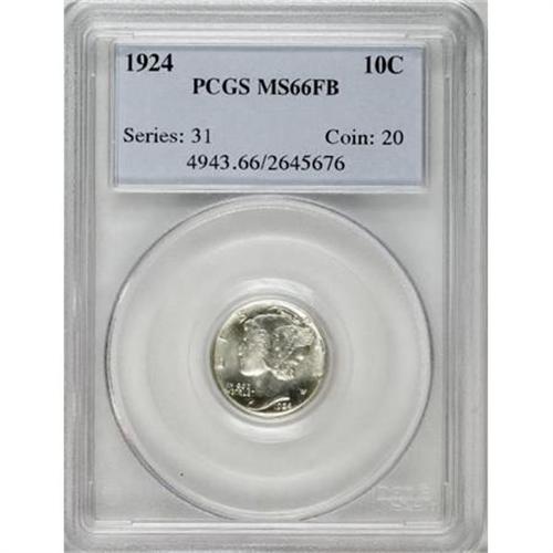 <B>1924 10C MS66 Full Bands PCGS.</B></I> A boldly impressed example of this Roaring Twenties issue, strongly lustrous with slightly granular silver-blue surfaces. PCGS has graded only 11 finer Full Bands coins (2/08).<BR><BR><B>Coin Engraver:</B> Adolph A. Weinman<BR><BR><b>Shipping:</b> Coins & Currency (<a target="_blank" href="http://www.heritageauctions.com/common/shipping.php">view shipping information</a>)