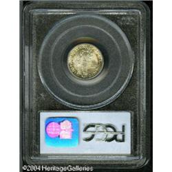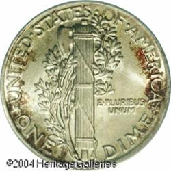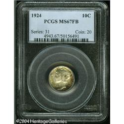 1924 10C MS67 Full Bands PCGS. The 1924-P is quite <B>1924 10C MS67 Full Bands PCGS.</B></I> The 1924-P is quite scarce in Gem and finer grades, especially with Full Band details, unlike many later Dimes from the Philadelphia Mint. The luster on this piece is bright and softly frosted and each side shows mottled peripheral shadings of deep russet and gold toning. As one can infer from the grade, there are no distracting abrasions on either side. Population: 9 in 67, 0 finer (10/04). <BR><BR><B>Important notice:</B> Heritage usually auctions material at the rate of 200-250 lots per hour. On some occasions eBay Live bid software or the Internet may not be able to keep up with the pace of the auction. We recommend placing a realistic absentee bid now as insurance to avoid disappointment. Occasionally the auctioneer may eliminate or reject an eBay Live bid, and the auctioneer may also reopen a lot after the close of the eBay live bidding (usually because we missed an audience bid), and may reject your bid even if it shows you as the winning bidder. By bidding via eBay Live, you agree that Heritage may award the lot to another bidder at its sole discretion under the circumstances described above or any other reasonable circumstances. Since eBay bids are not shown to us until we open the lot on the floor, we treat those bids just like floor bids. In most cases the floor responds before the eBay bid is presented to us, due to Internet lag time, so for consistency we have made it a policy that floor bids are always considered first over tie eBay live bids. Also please note that all Heritage lots purchased through eBay Live carry a 20% Buyer's Premium. Please make sure you read the Terms and Conditions before you bid. This lot is being auctioned in conjunction with a live floor auction by Heritage Galleries & Auctioneers. All final auction and invoice information will be supplied by Heritage Galleries & Auctioneers, and all other information should be considered preliminary. Lot:5805