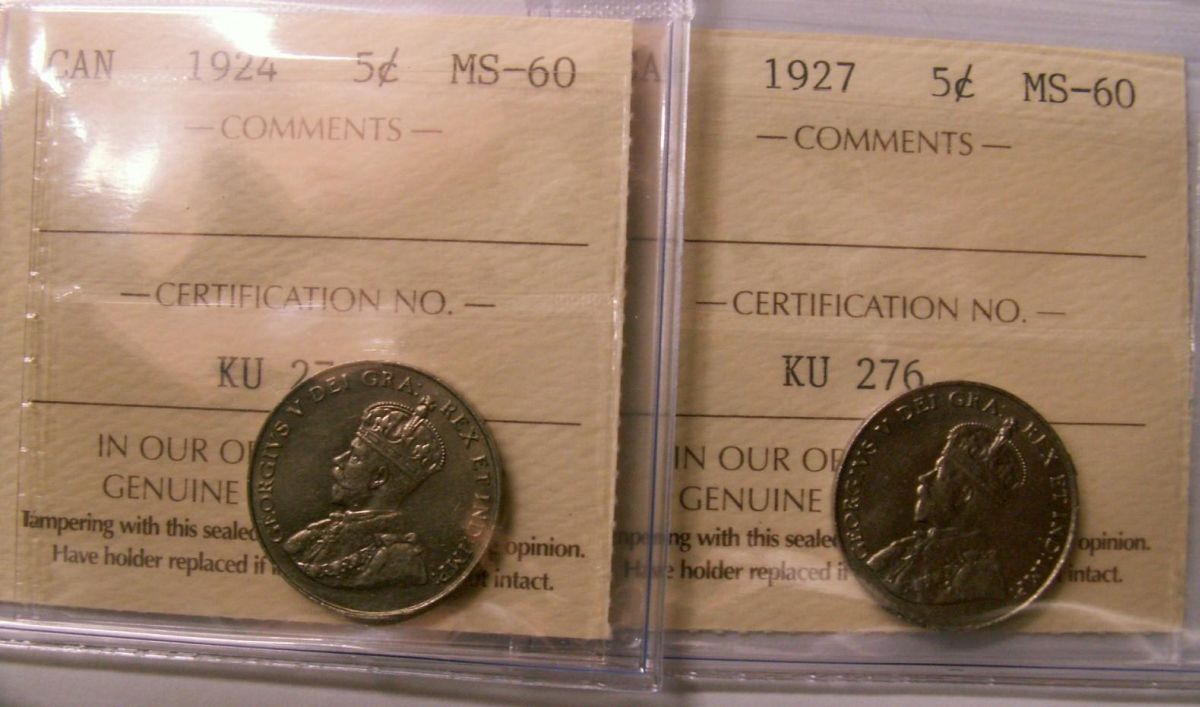 1924 & 1927 5¢ ICCS MS60. Lot of 2 coins.