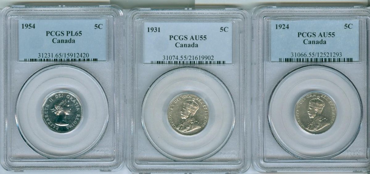 1924, 1931 5¢ PCGS AU55 & 1954 PCGS PL65. Lot of 3 coins.