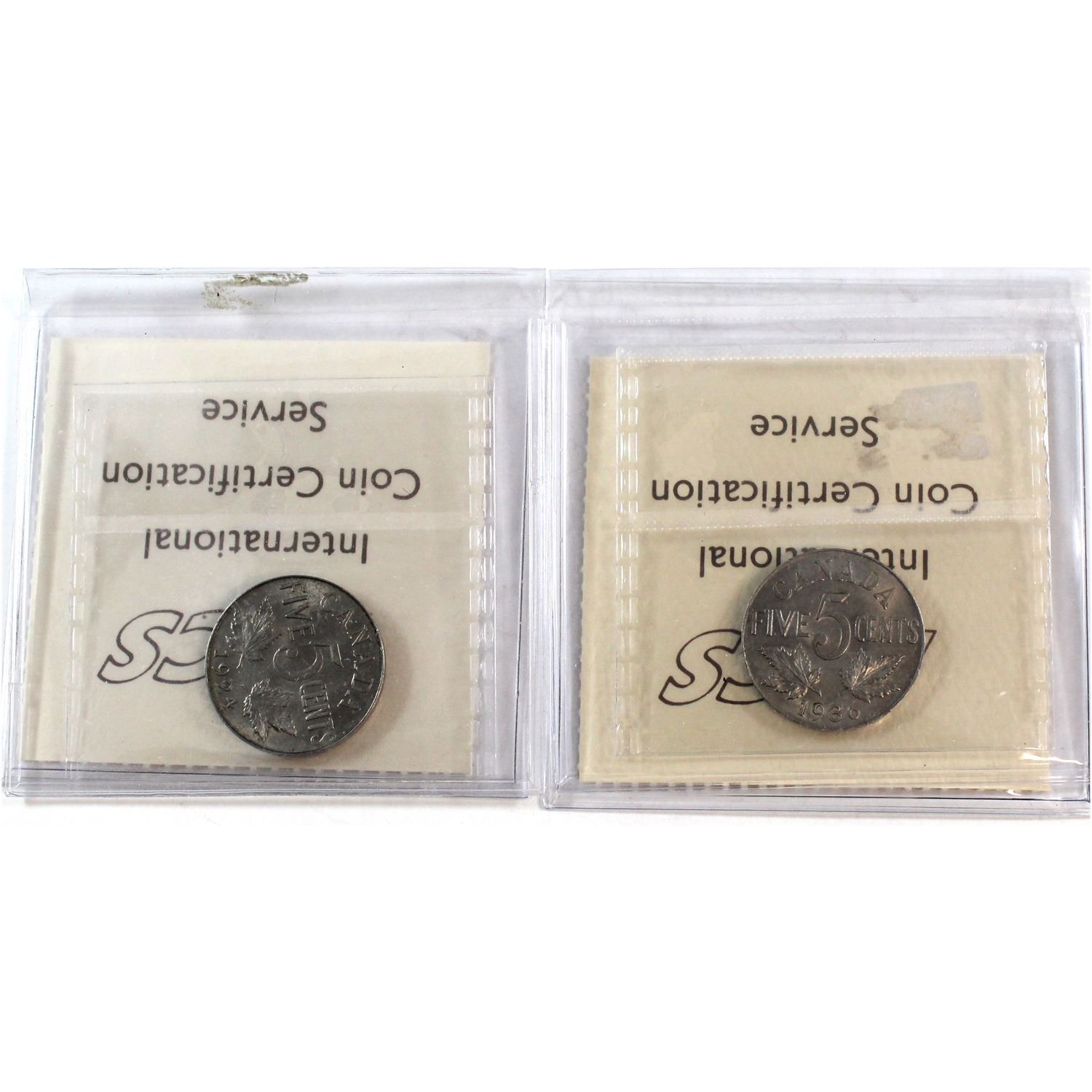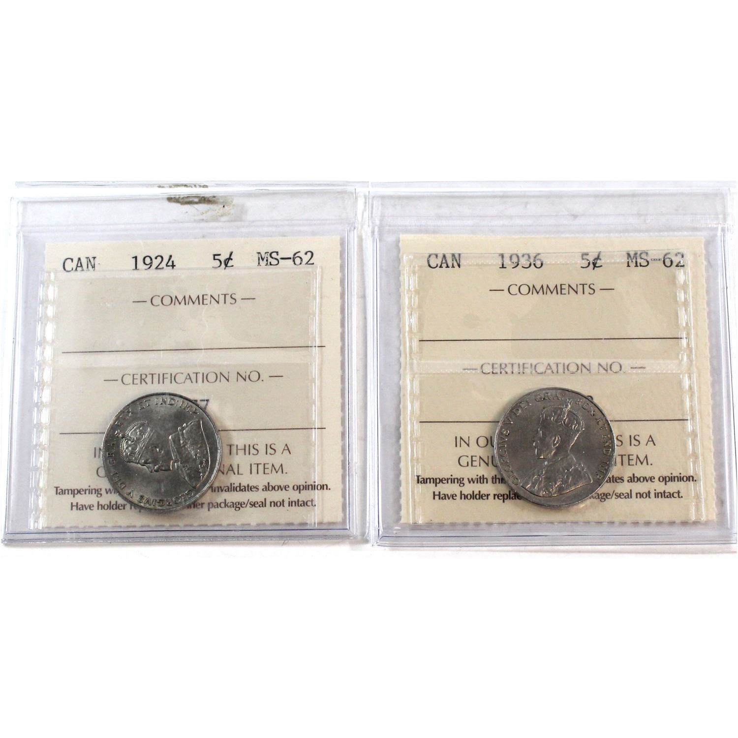 1924 & 1936 Canada 5-cent ICCS Certified MS-62. 2pcs