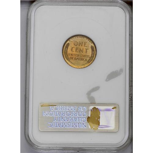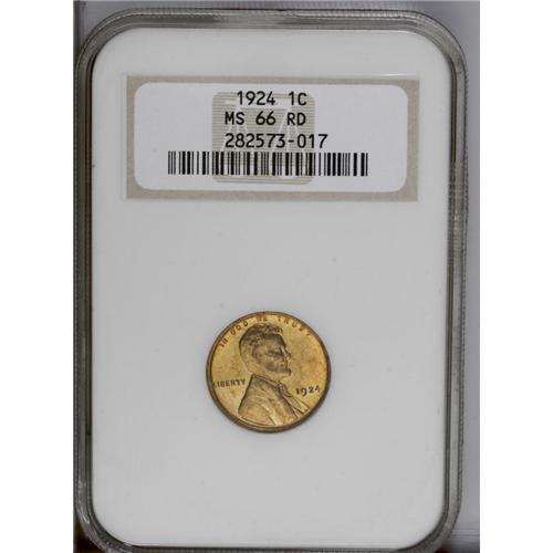 <B>1924<1C> MS66 Red NGC.</B></I> A solidly struck orange-copper piece with patches of emerald and coral on the well-preserved surfaces. Housed in an early holder. Census: 23 in 66 Red, 1 finer (8/06).