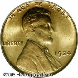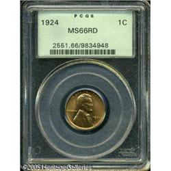 <B>1924 1C MS66 Red PCGS.</B></I> An intense satiny sheen radiates from both sides and the impeccable surfaces are just a bit of softness on the portrait from consideration at the Superb level. Lot:5486